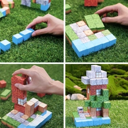 - 14× kocka (kamen), 19× kocka (trava), 15× kocka (listje), 15× kocka (opeka), 15× kocka (voda), 14× kocka (les), 14× kocka (zemlja), 1× kocka (peč), 1× kocka (poseben vzorec)
