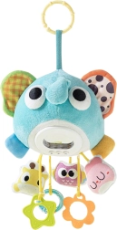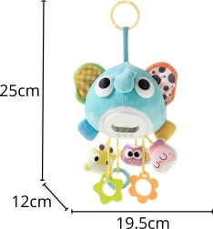Na slončkovo telo so pritrjeni 4 interaktivni visečki – grizalo za olajšanje pri izraščanju zob in ropotuljice za trening prijema in koordinacije. Kompaktne dimenzije in trpežna zanka olajšajo obešanje in prenašanje, zato je odlična izbira za doma in na potovanjih.