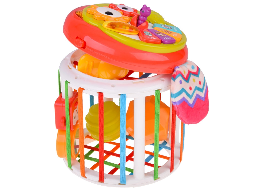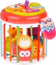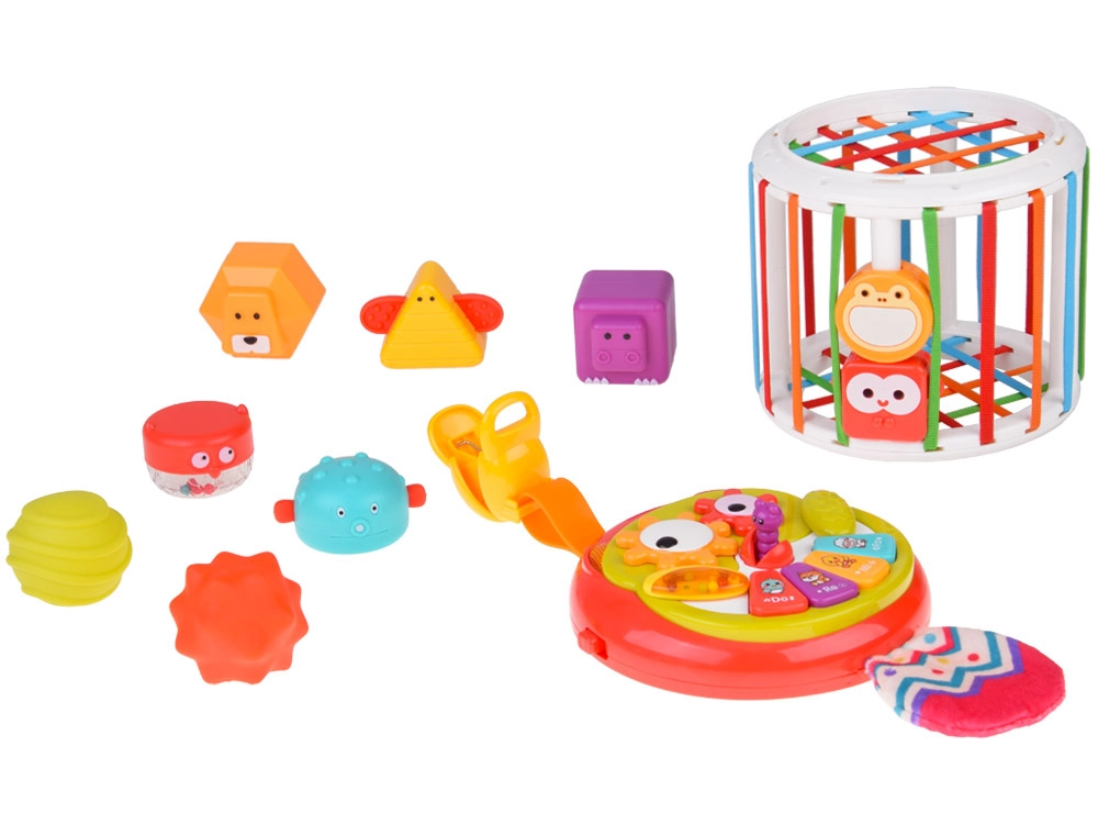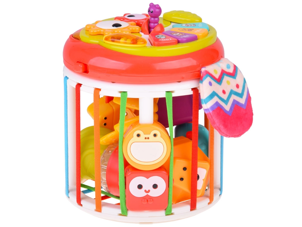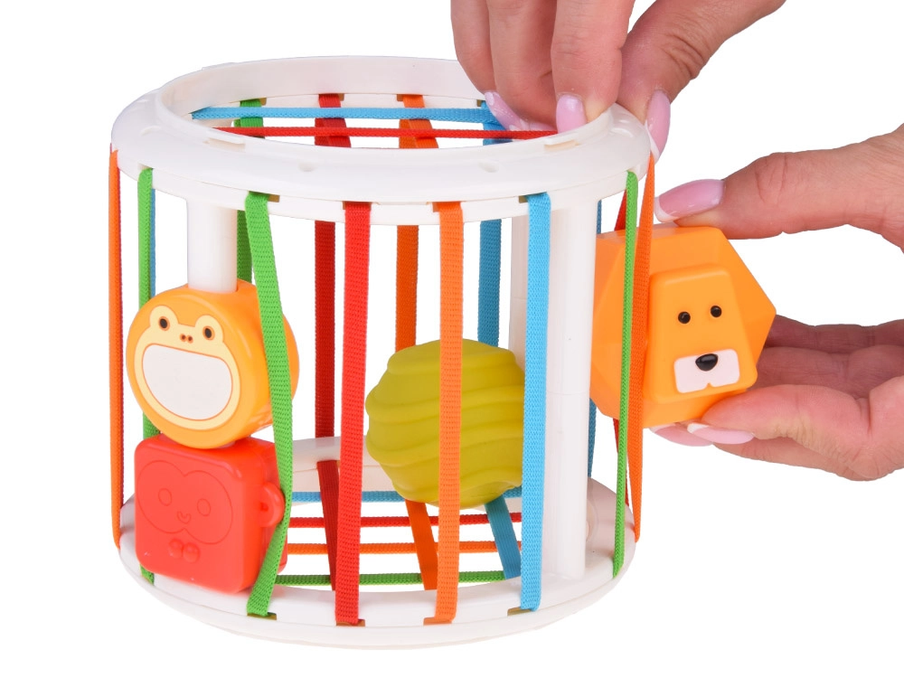 Sortirka je sestavljena iz elastičnih barvnih trakov, ki omogočajo enostavno vstavljanje in izvlek delčkov ter naravno razvijajo prijem, moč in natančnost prstov. Ne manjka majhno varno ogledalce za odkrivanje lastnega odseva in komplet 7 raznobarvnih elementov za vstavljanje. Celota spodbuja sluh, vid in tip, podpira koncentracijo in samostojno raziskovanje.