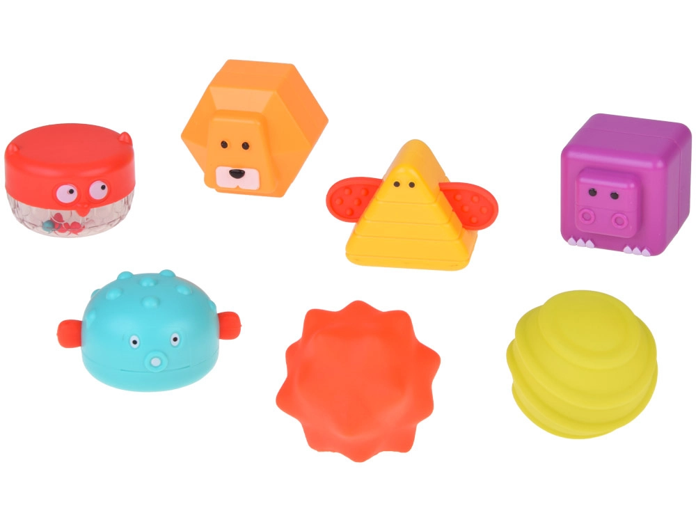 Barvne gumice omogočajo lahko vstavljanje in izvlek delčkov, urijo prijem, natančnost in moč prstov. Priloženih je 7 različnih oblik in majhno ogledalce za senzorično raziskovanje.