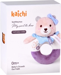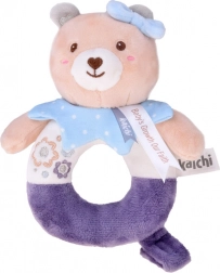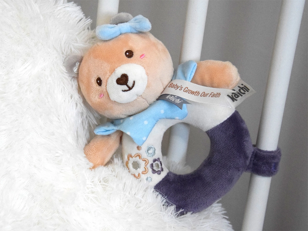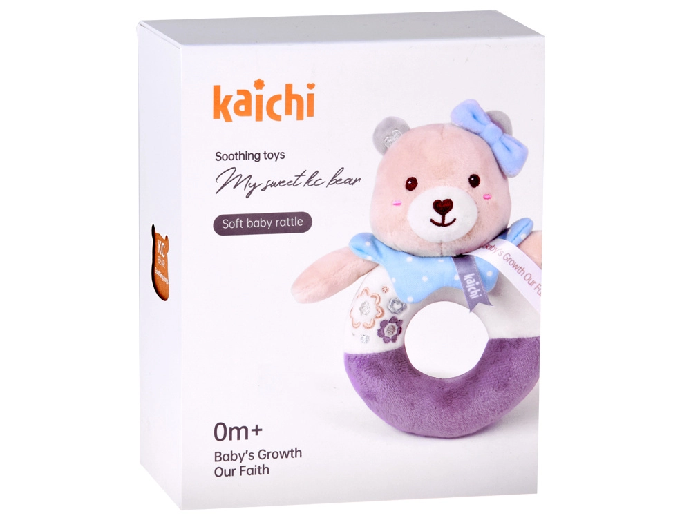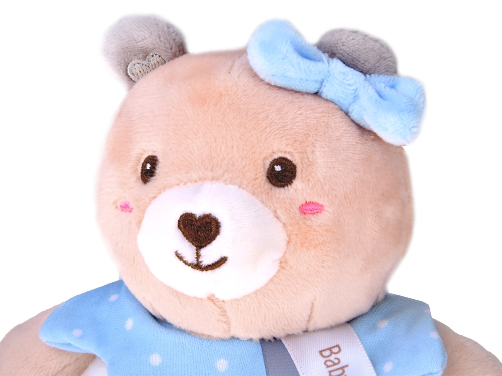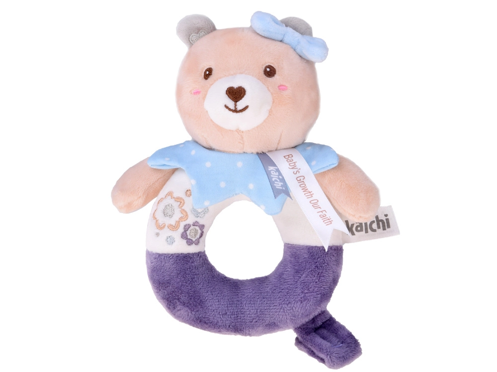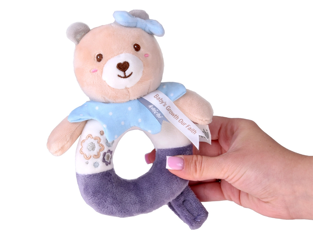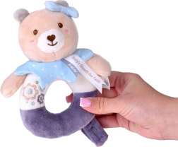 Plišasta ropotuljica medvedek je sešita iz kakovostnih in zelo mehkih materialov, prijetnih na dotik. Oblika obročka omogoča lahko prijemanje in držanje, zato je idealna za prve poskuse dojenčka pri vaji prijema. Nežni, izvezeni detajli (očesca, gobček, okrasni elementi) zagotavljajo največjo varnost brez drobnih delov.