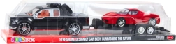 Črni pick-up s prikolico in rdečim športnikom tvori realistično sestavo za tematsko igro.