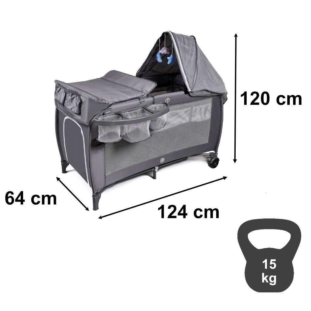 Ta večnamenska potovalna posteljica raste z vašim otrokom od rojstva do približno 36 mesecev. Robustno ogrodje v obliki X in dve višinski ravni ležišča zagotavljata varnost in udobje, medtem ko mrežasti paneli omogočajo odlično kroženje zraka in dober pregled nad dojenčkom. Strešica s komarnikom ščiti pred insekti, viseče plišaste igračke pa zabavajo malčka.