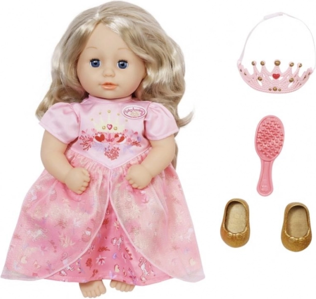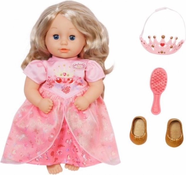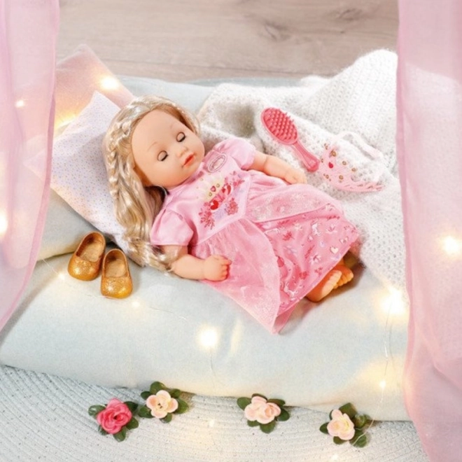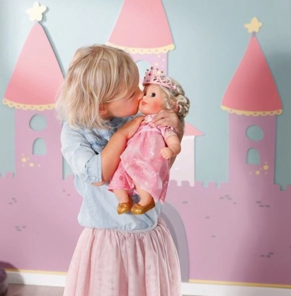 Pod rožnato obleko z tilnim volanom zasijejo zlate balerinke, ki dopolnjujejo njen kraljevski videz. Zaradi kroja obleke easy fit je preoblačenje igra za male otroške ročice. Lutka spodbuja razvoj kreativnosti in odgovornosti pri otrocih že od enega leta starosti.