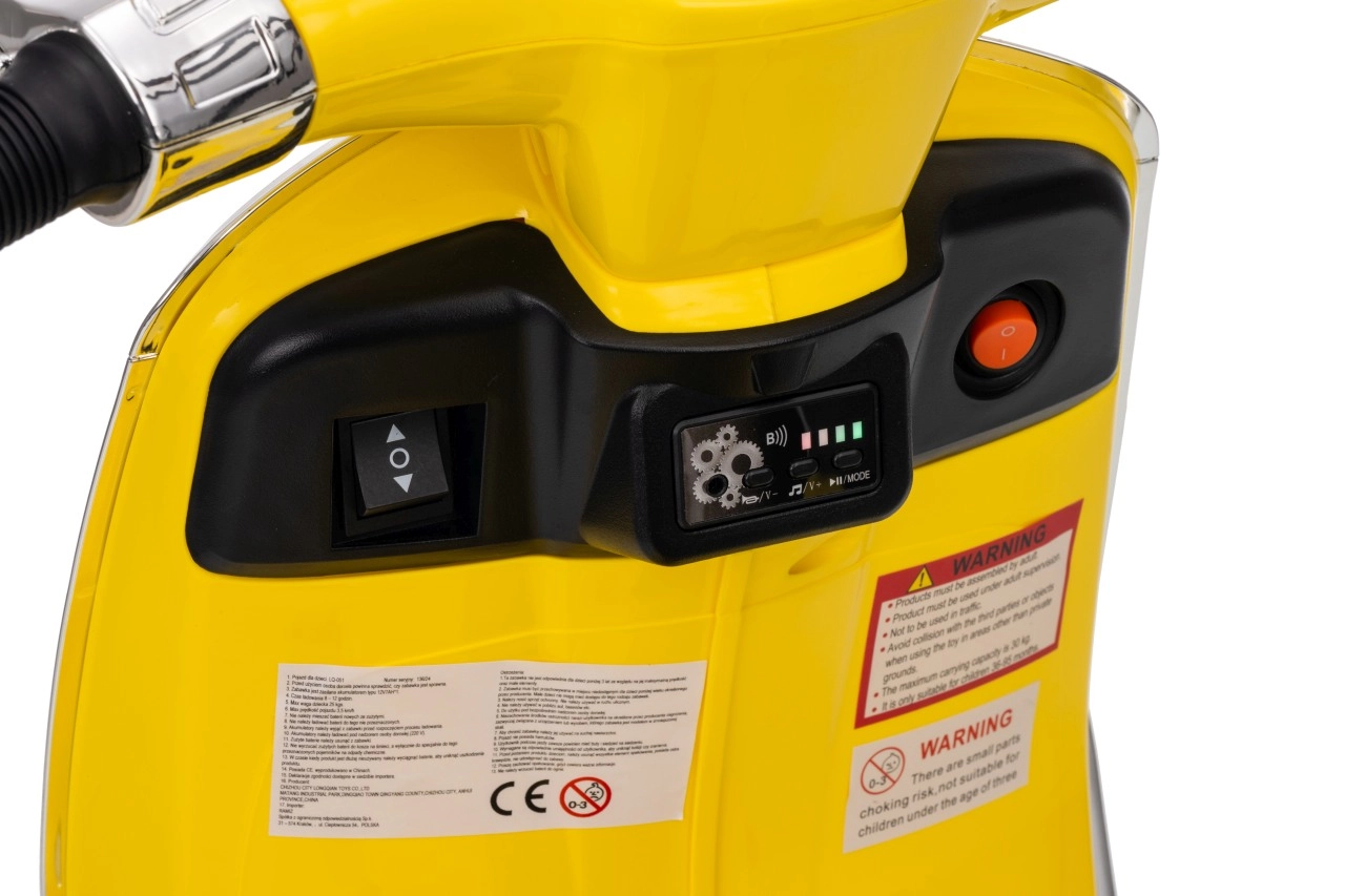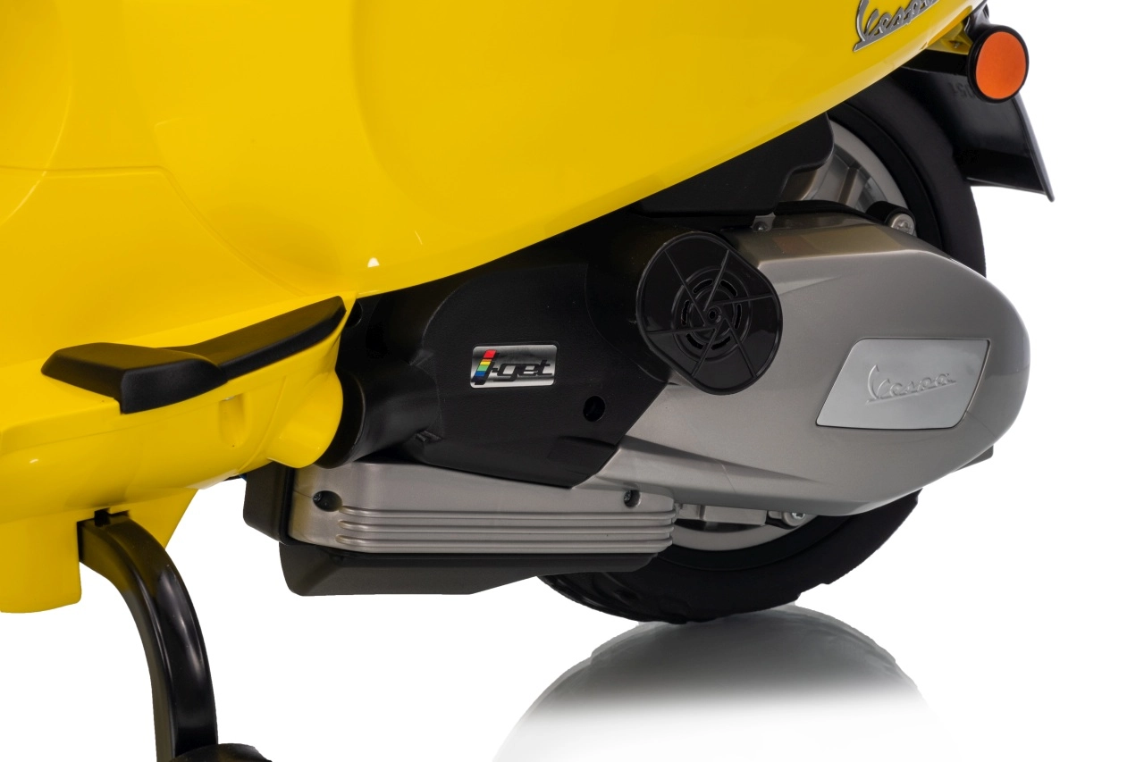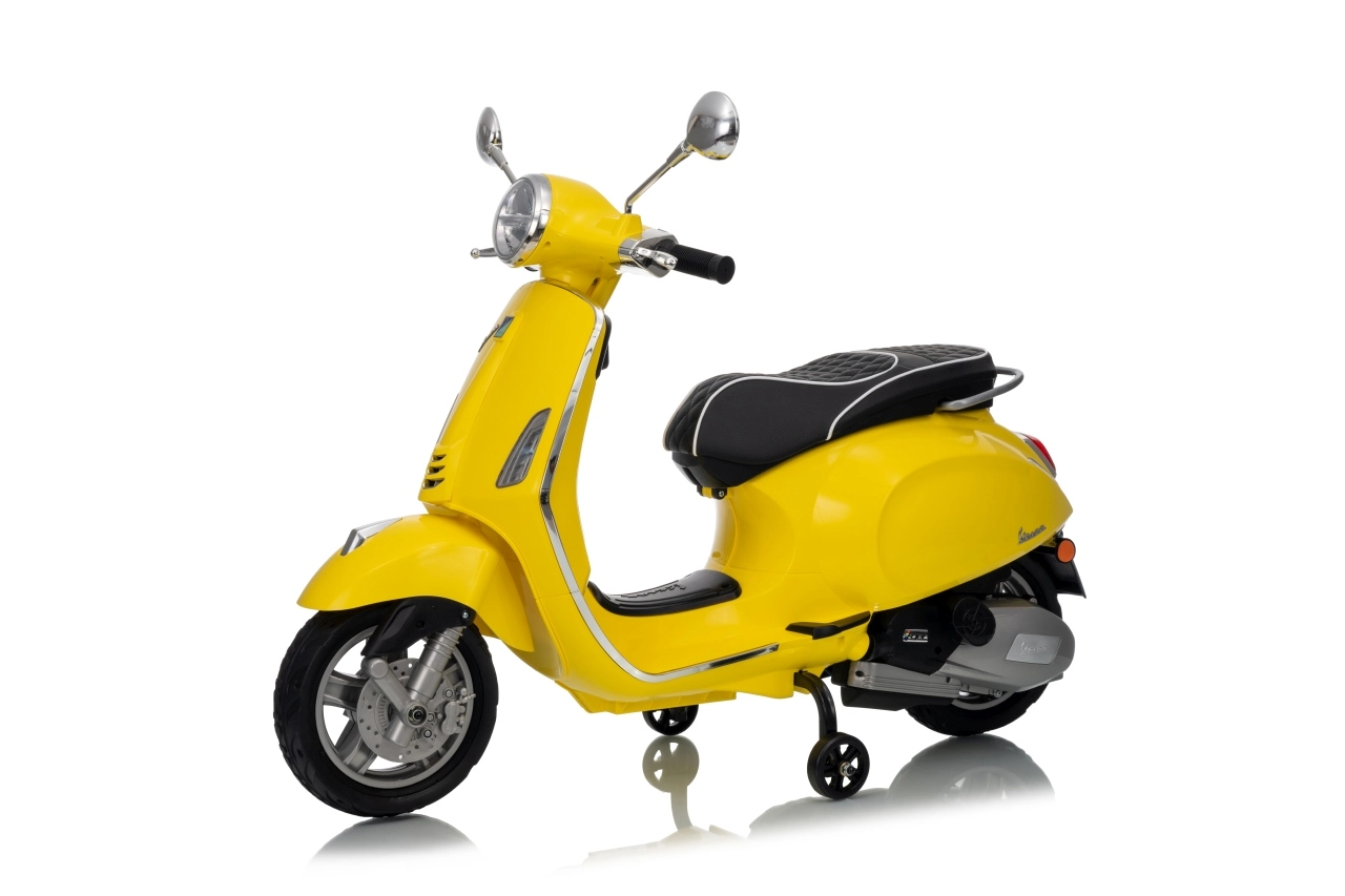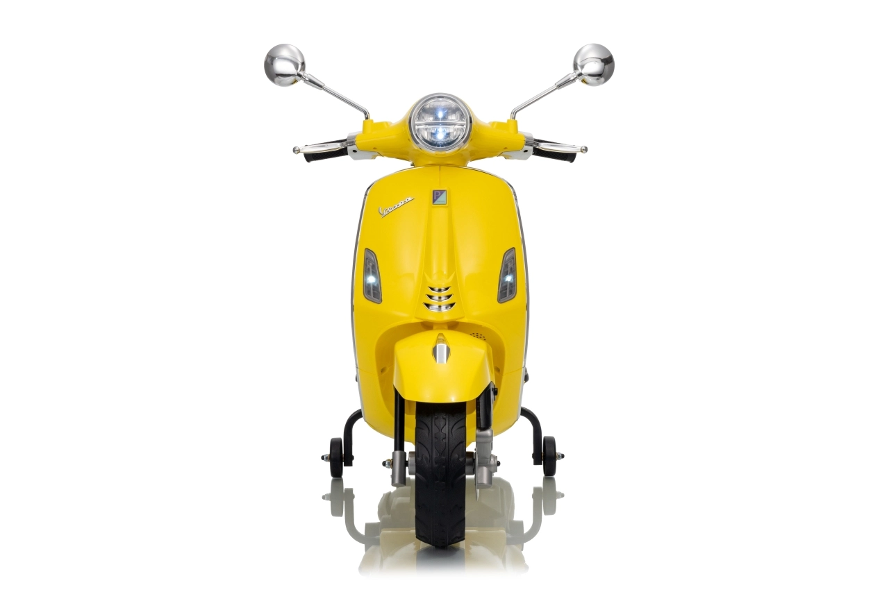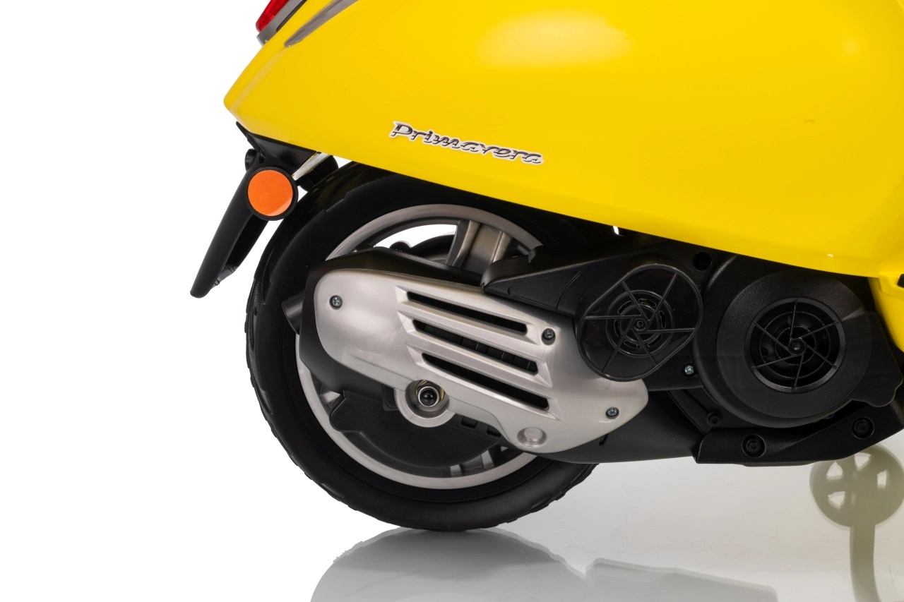 Stilski otroški električni skuter VESPA ROMA v živahni rumeni barvi ponuja otrokom varno zabavo in prve vozne izkušnje. Zahvaljujoč dvema motorjema 2×35 W, bateriji 12 V 7 Ah, mehkim EVA kolesom in mehkem zagonu je vožnja udobna in stabilna. Ne manjkajo sprednje in zadnje LED luči, avdio plošča z MP3/Bluetooth/AUX, indikator napolnjenosti ter udoben sedež iz eko usnja. Odlična izbira za male voznike.