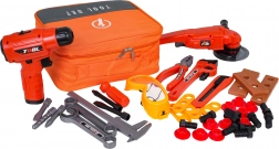 - torba, akumulatorski vrtalnik/vijačnik, kotni brusilnik, pomično merilo, nastavljivi ključ, obročni in ploščati ključ, klešče, nož, izvijač z nastavkom in biti, zaščitna očala, 7× element za privijačenje, 10× matica, 10× vijak