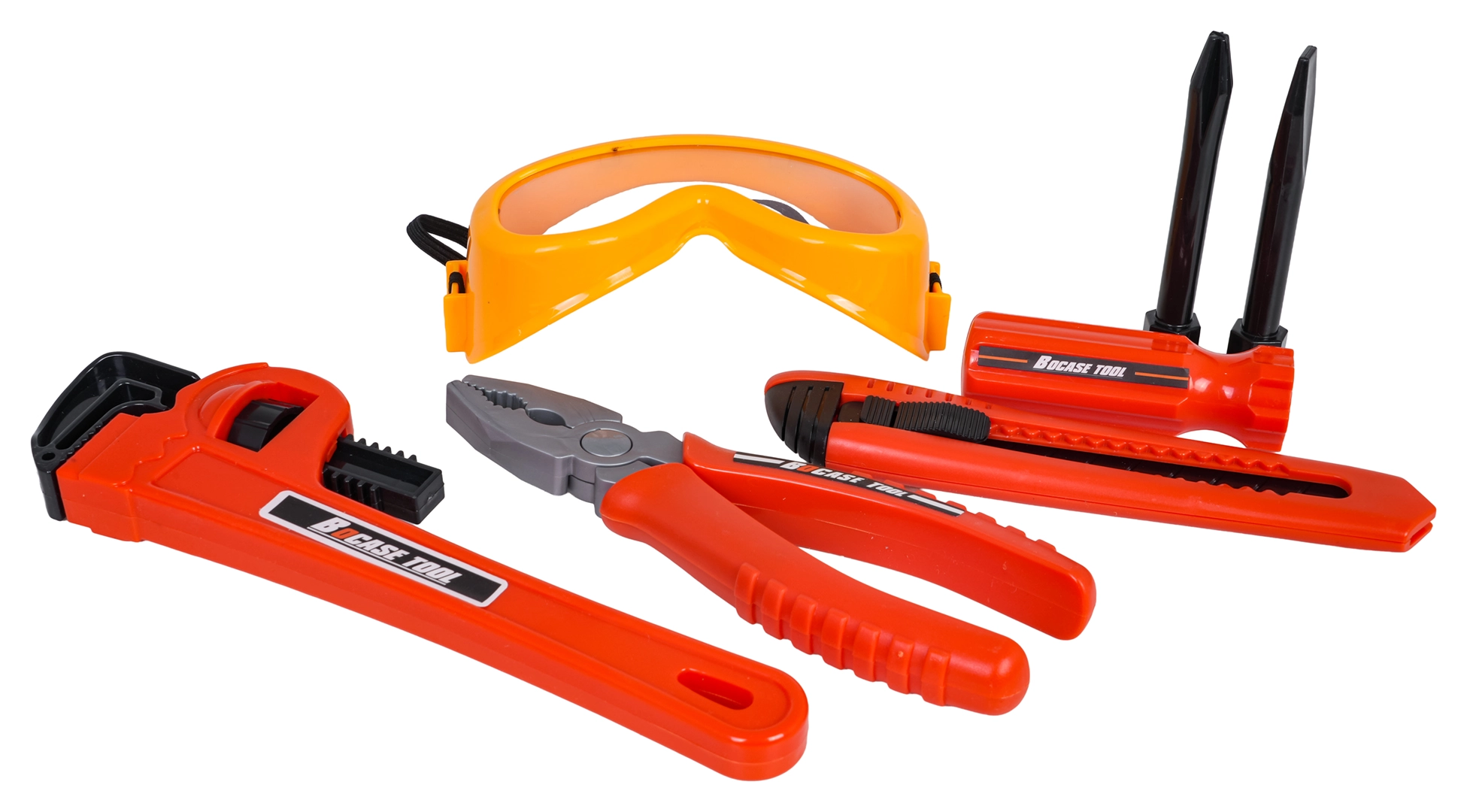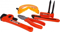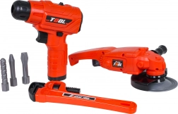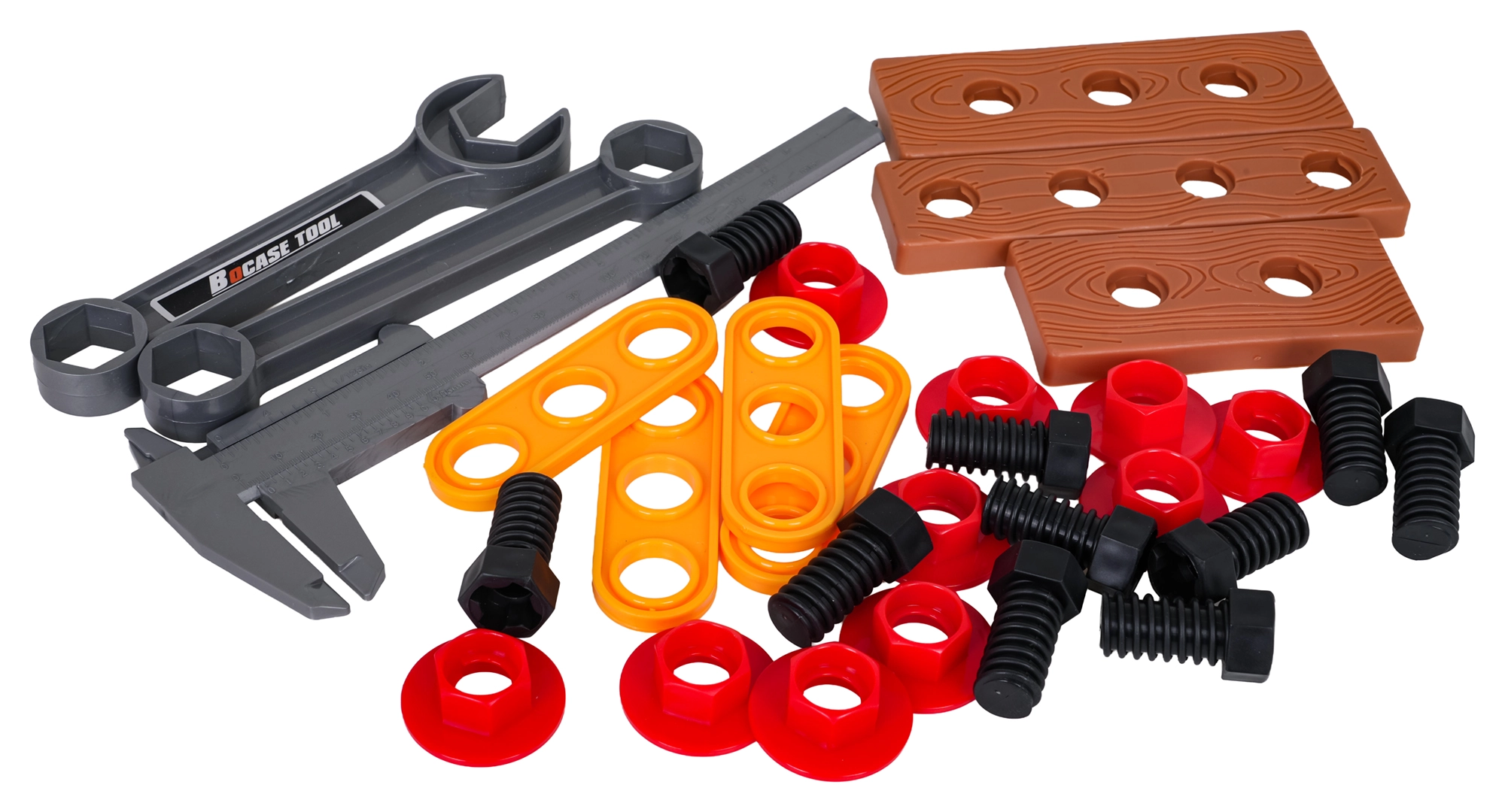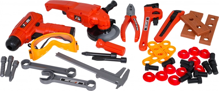 V kompletu je tudi kotni brusilnik z ročno vrtljivim kolutom, kompleti ključev, klešče, nož, izvijač z biti, pomikalo (pomično merilo) in zaščitna očala. Otroci lahko vadijo fino motoriko, logiko in domišljijo pri povezovanju delov s vijaki in maticami.