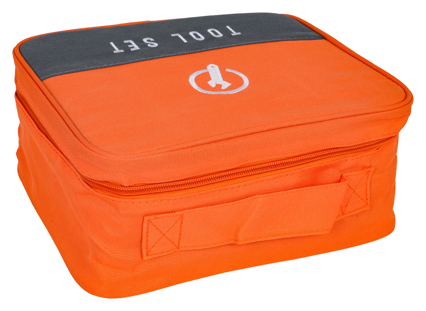 Vzdržljiva tekstilna torba z zadrgo in ojačanim ročajem ohranja orodje skupaj. Idealna za shranjevanje in prenašanje celotnega kompleta.