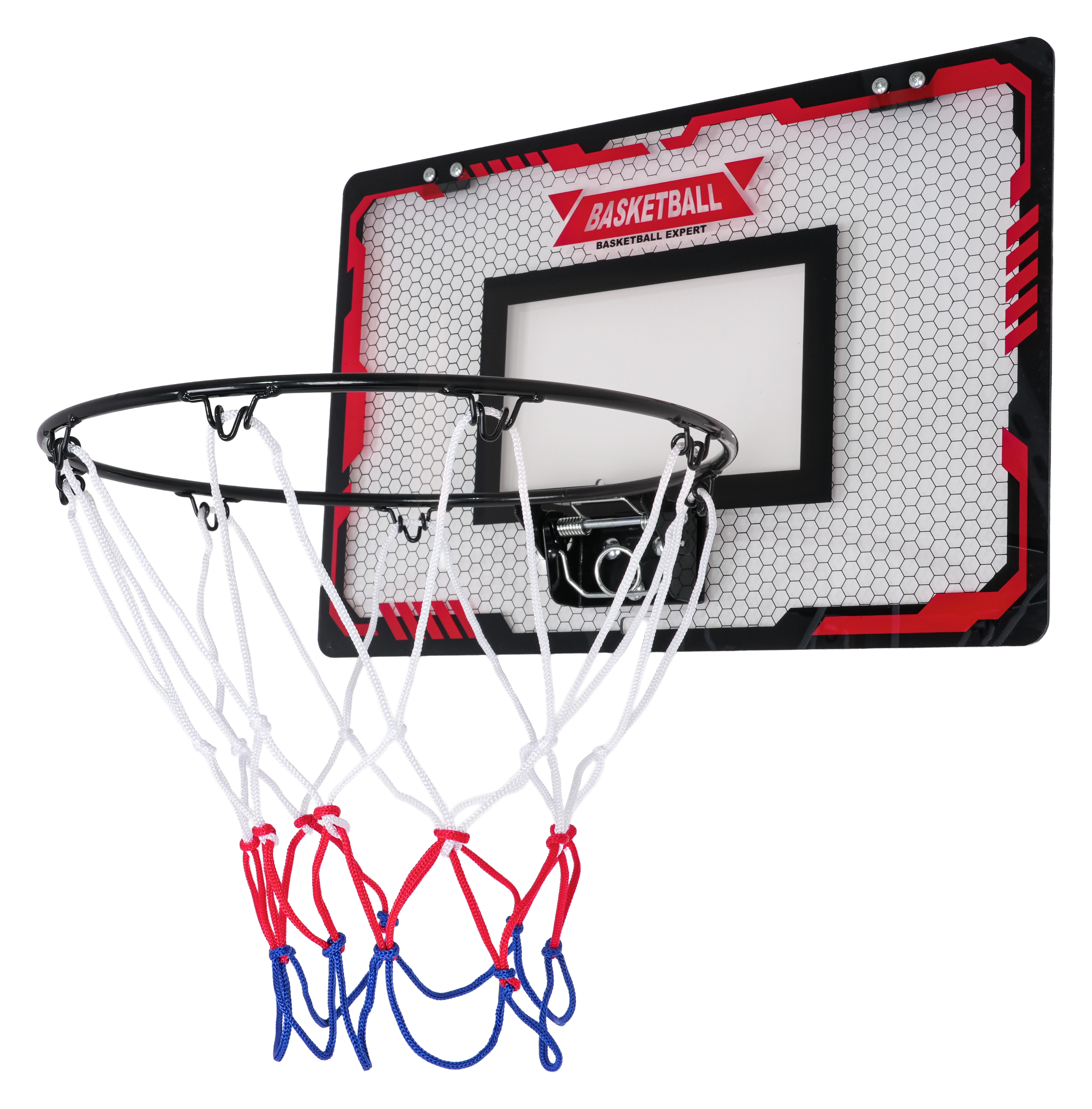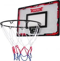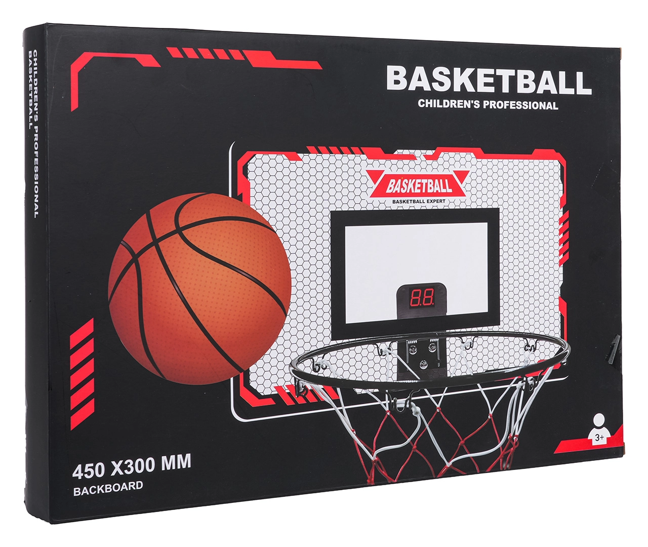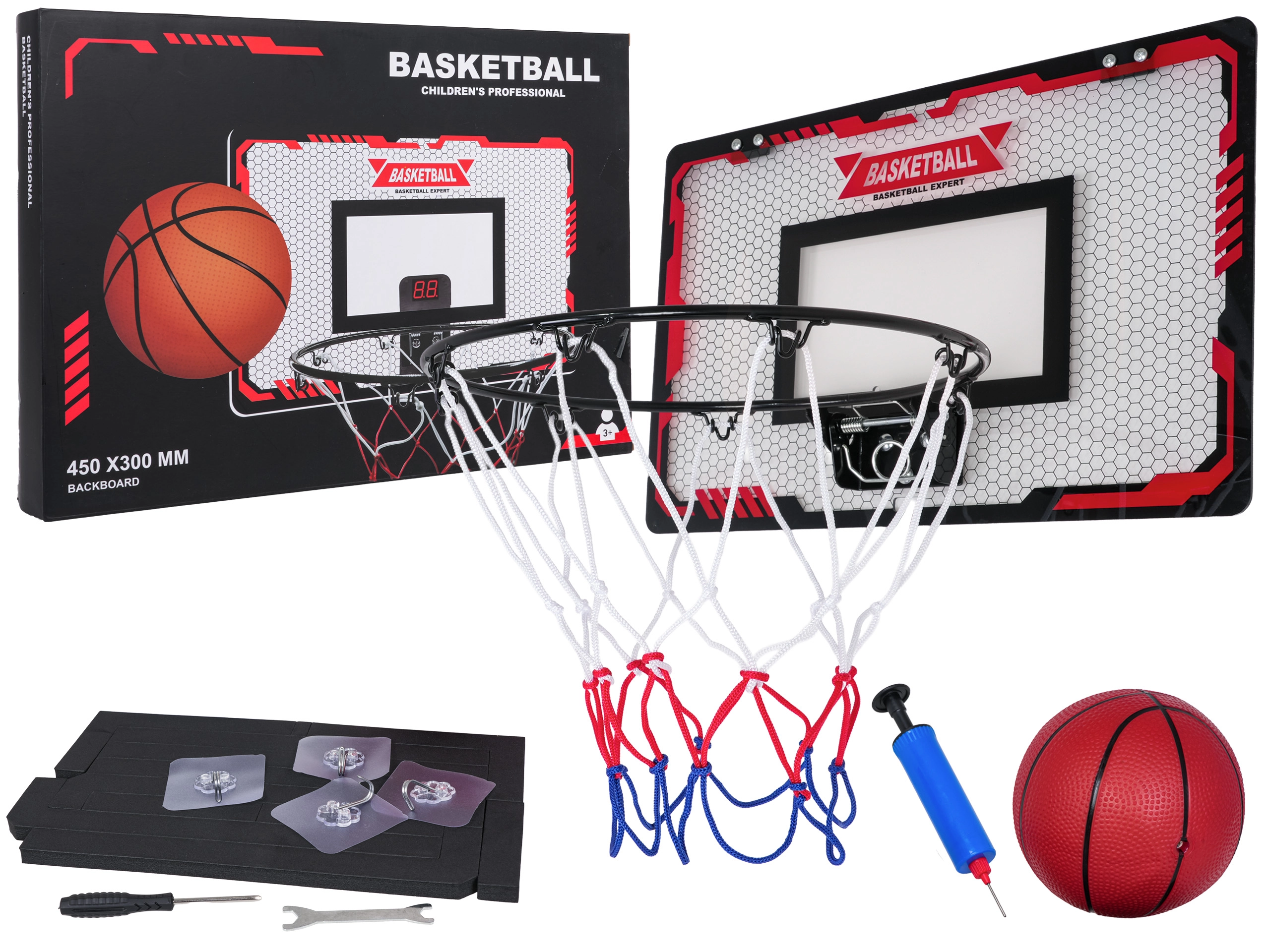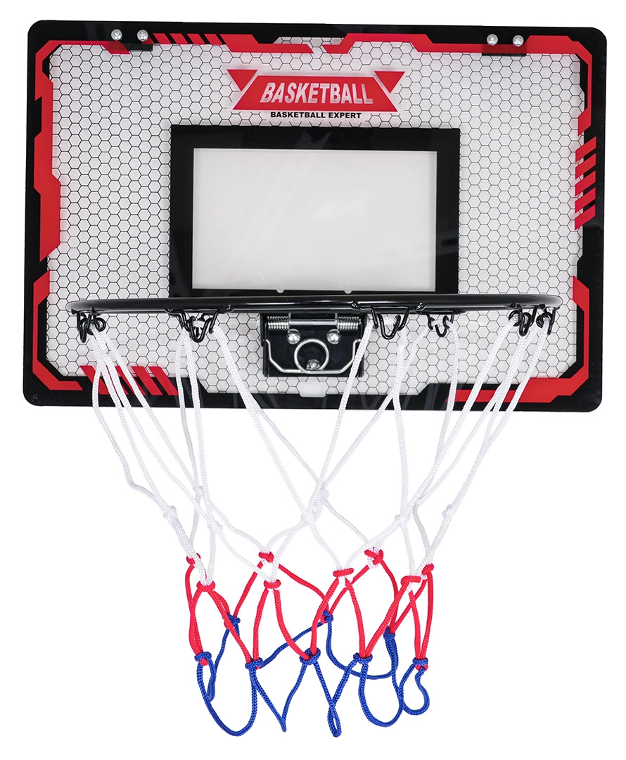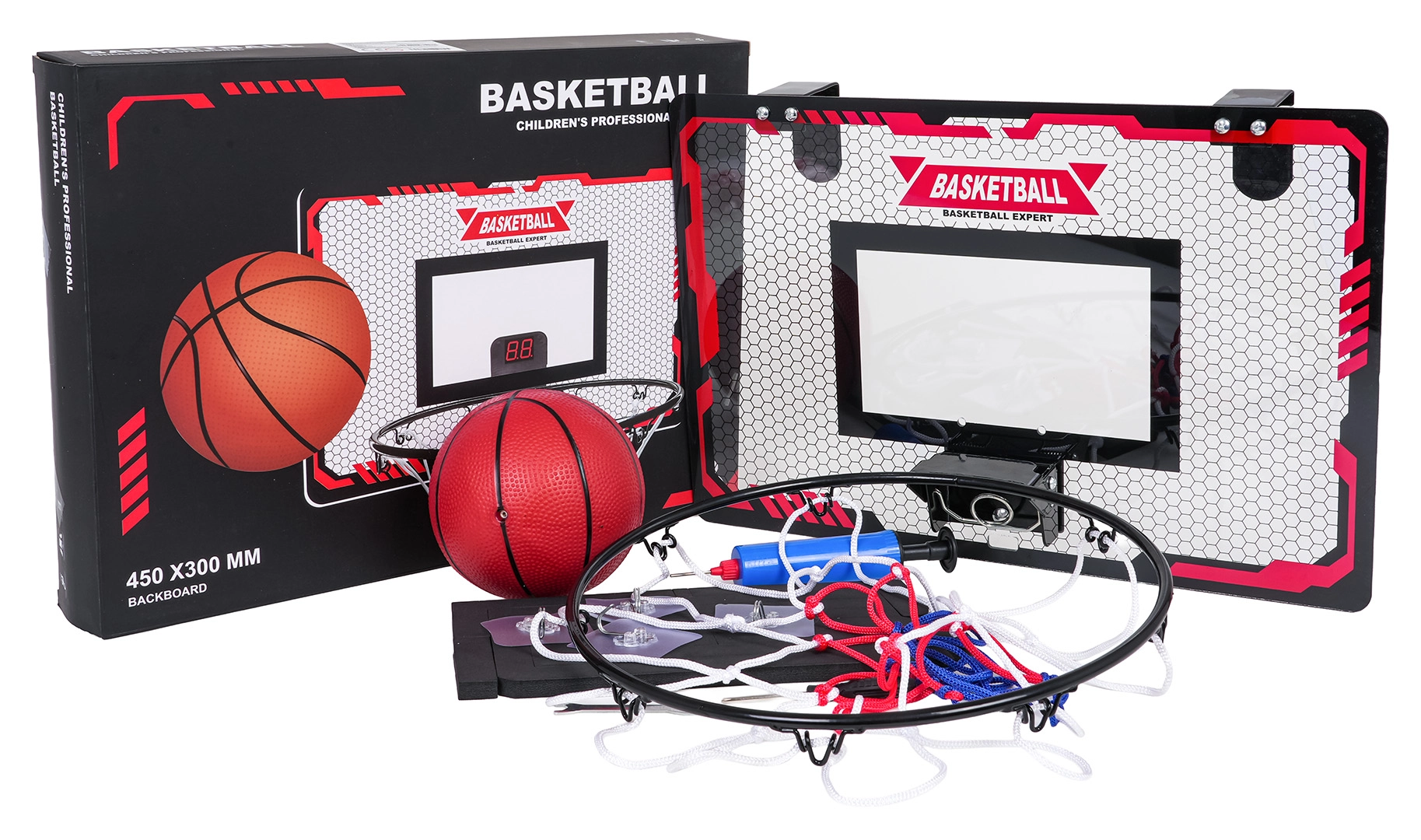 Set vsebuje vse za takojšnjo igro: čvrsto plastično tablo, kovinski obroč z mrežo, gumijasto žogo, tlačilko z iglo in celoten montažni komplet, vključno z izvijačem in ključem. Idealno za otroško sobo, hodnik ali igralnico – podpira koordinacijo oko–roka, natančnost in tekmovalnost.