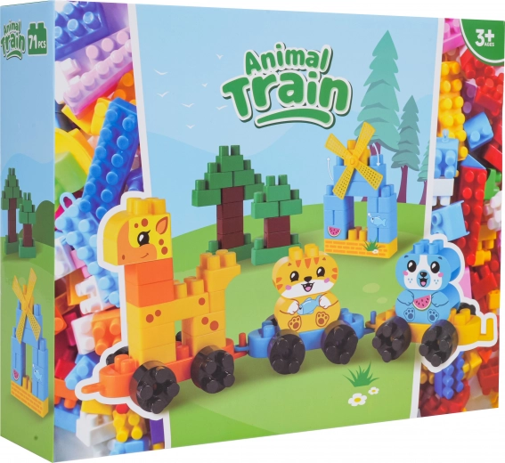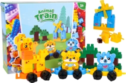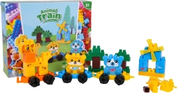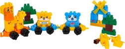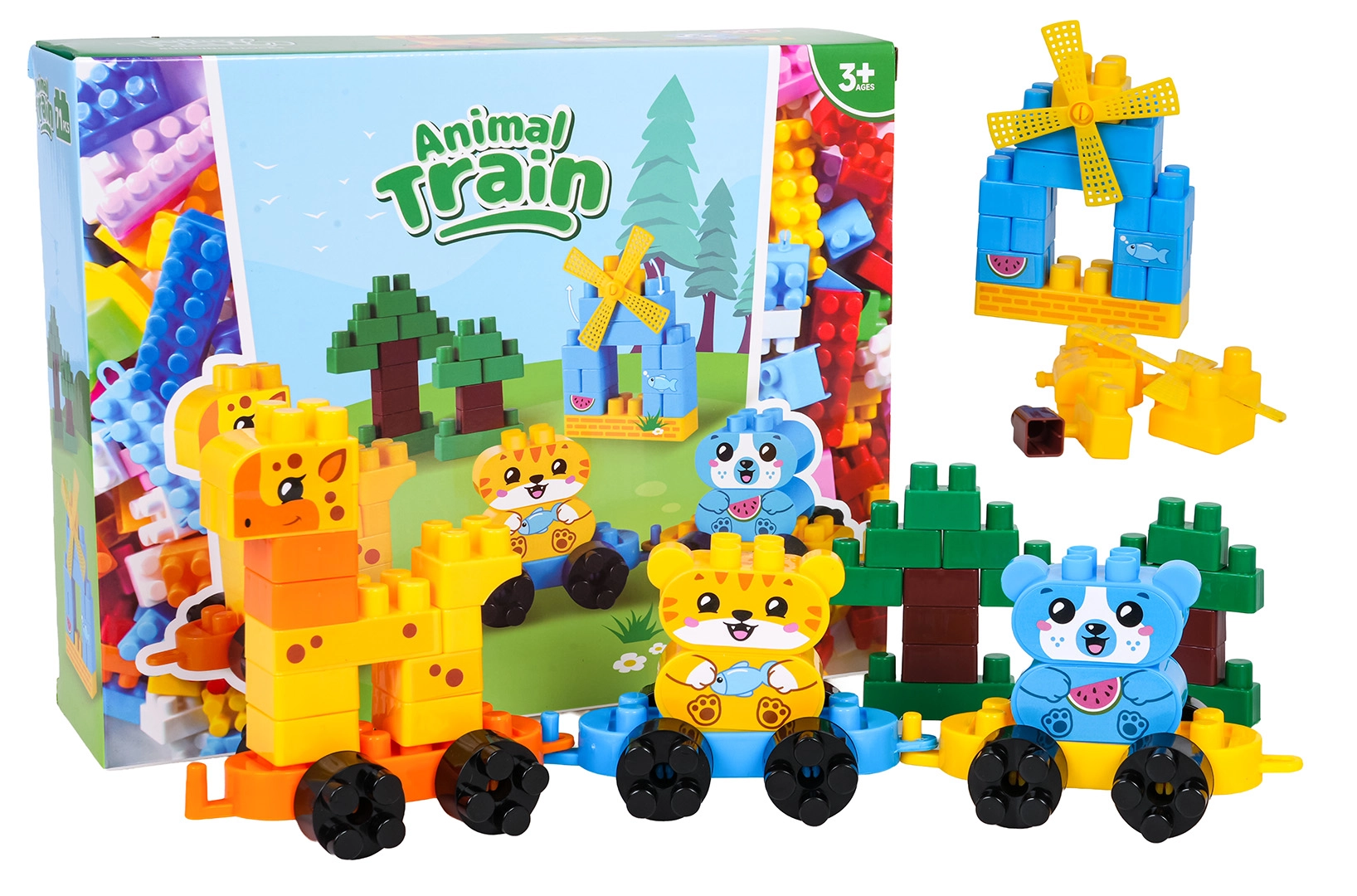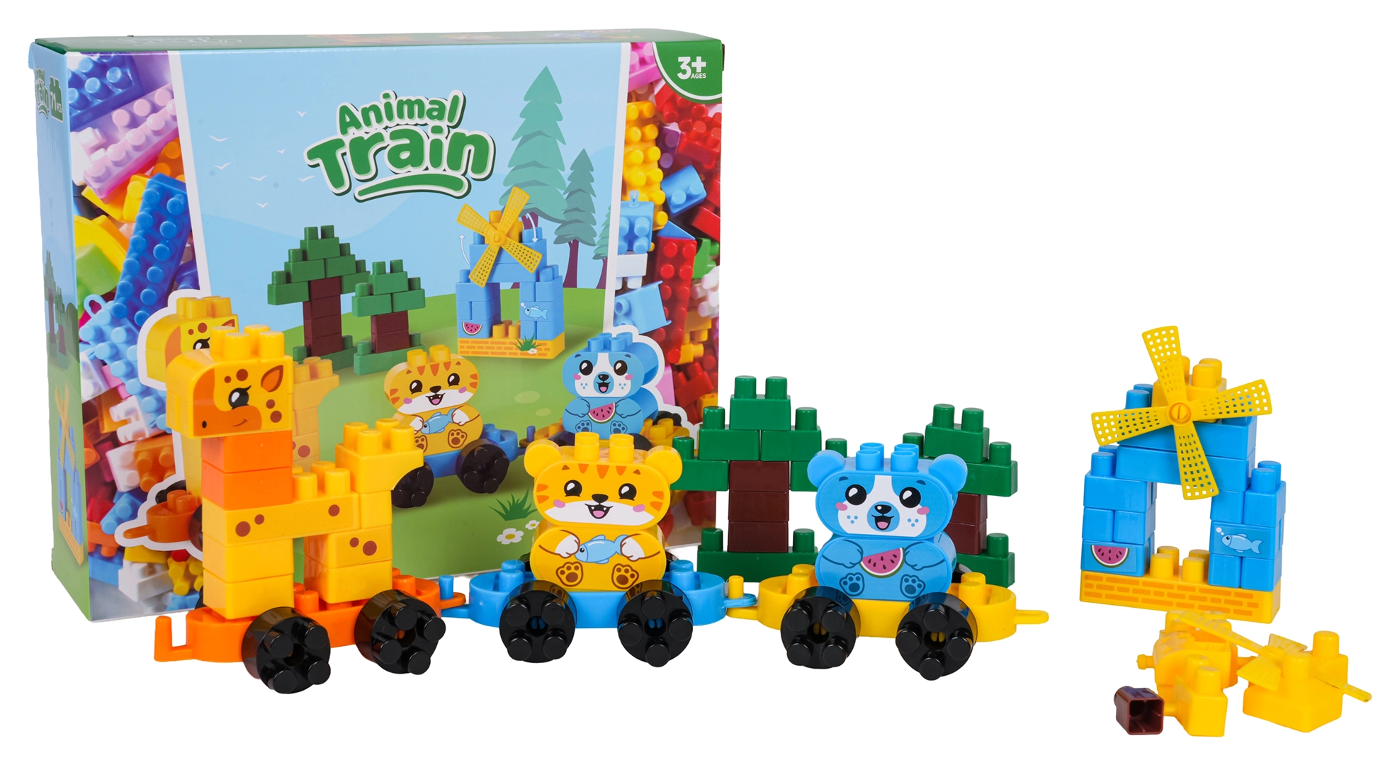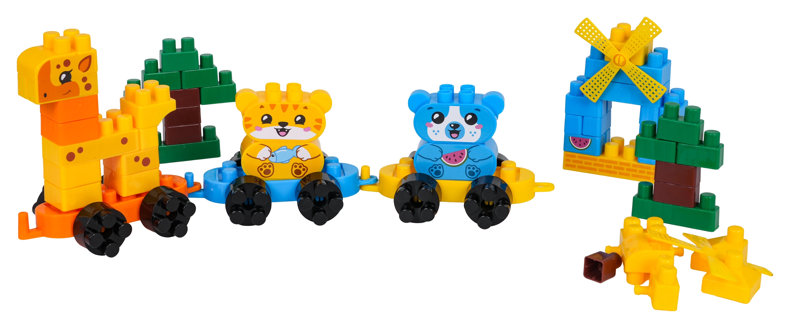 Odkrijte velik komplet barvitih gradbenih kock, iz katerih otroci preprosto sestavijo ljubke živali na podvozjih, drevesa in majhen mlin. Povežite posamezne vagone in ustvarite vlečni živalski vlak, ki zaradi koles resnično vozi. Komplet je zasnovan za male graditelje od 3 let – kosi so večji, prijetni za držanje in odlično se sestavljajo.