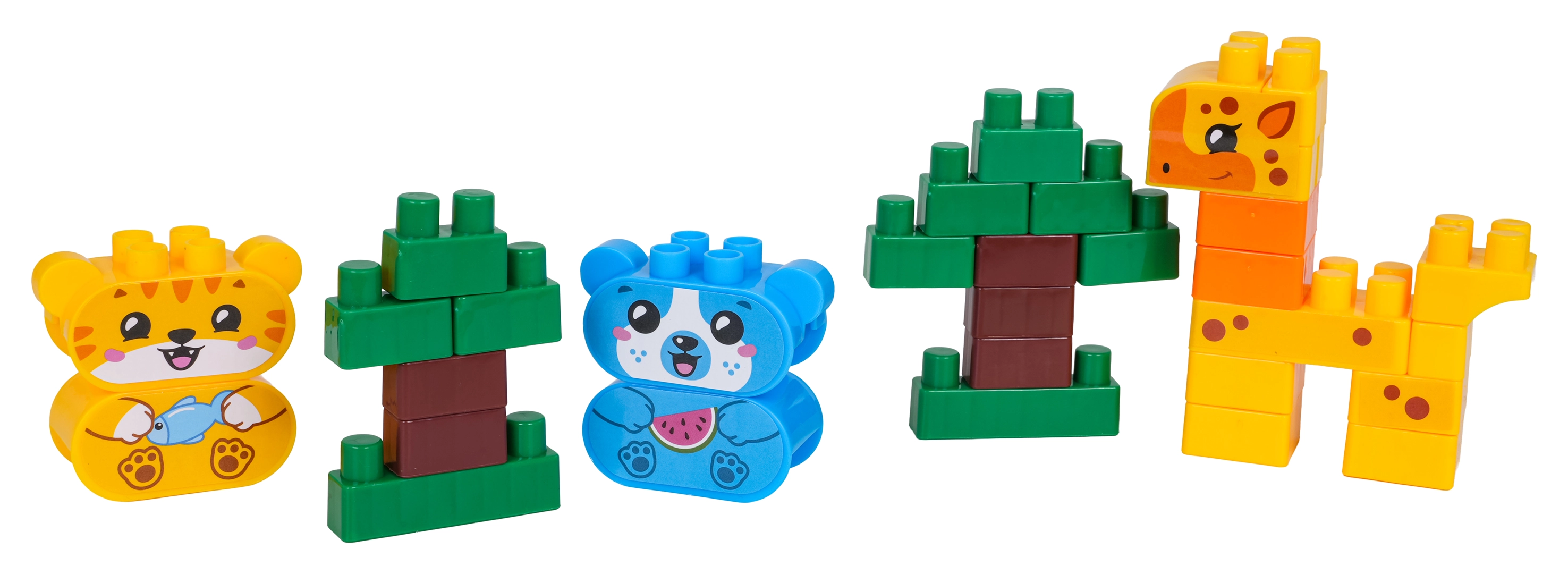 Kocke spodbujajo razvoj domišljije, koordinacijo oko–roka in ustvarjalno igro. Del pakiranja so tudi dekorativne nalepke za dokončanje videza živali in prizorov.