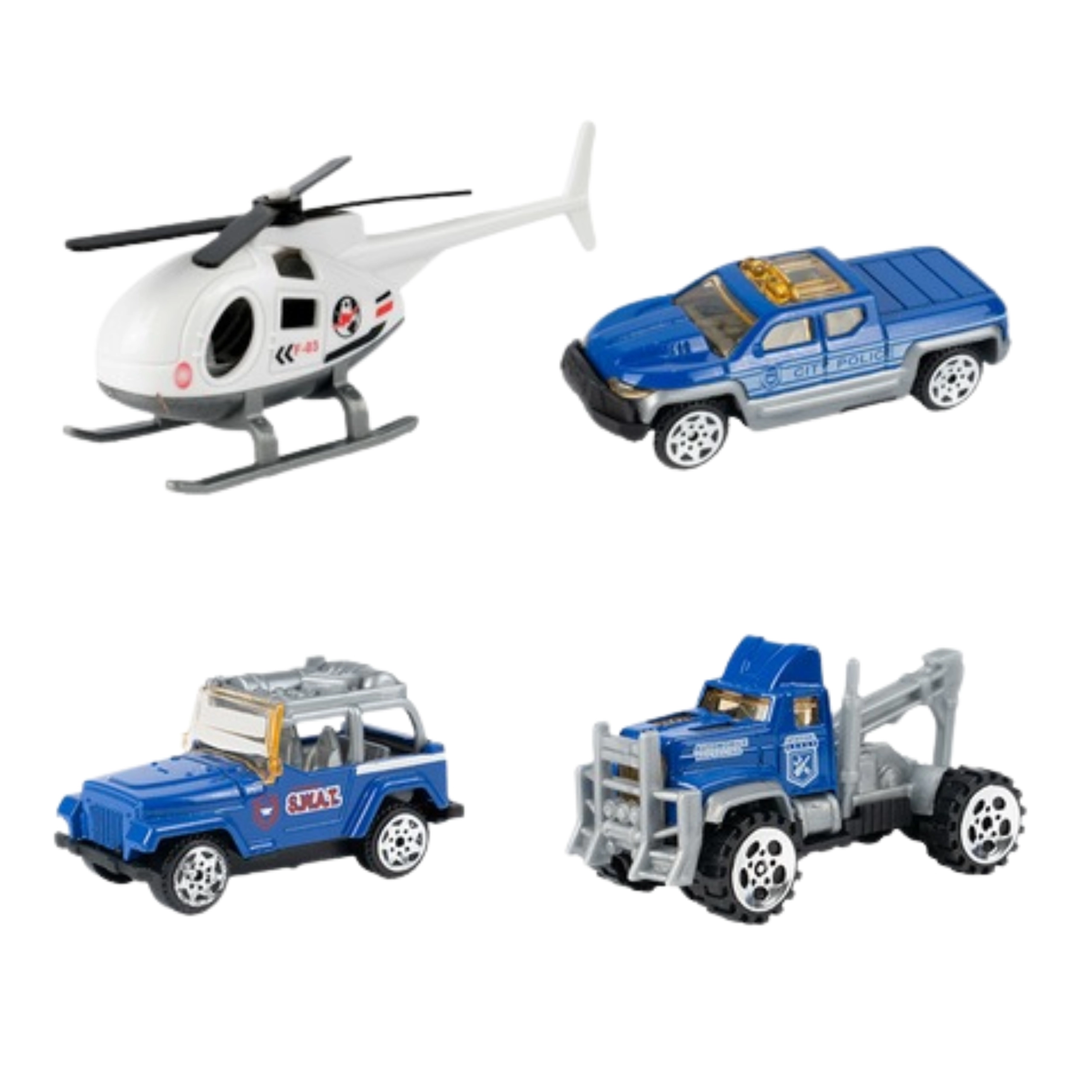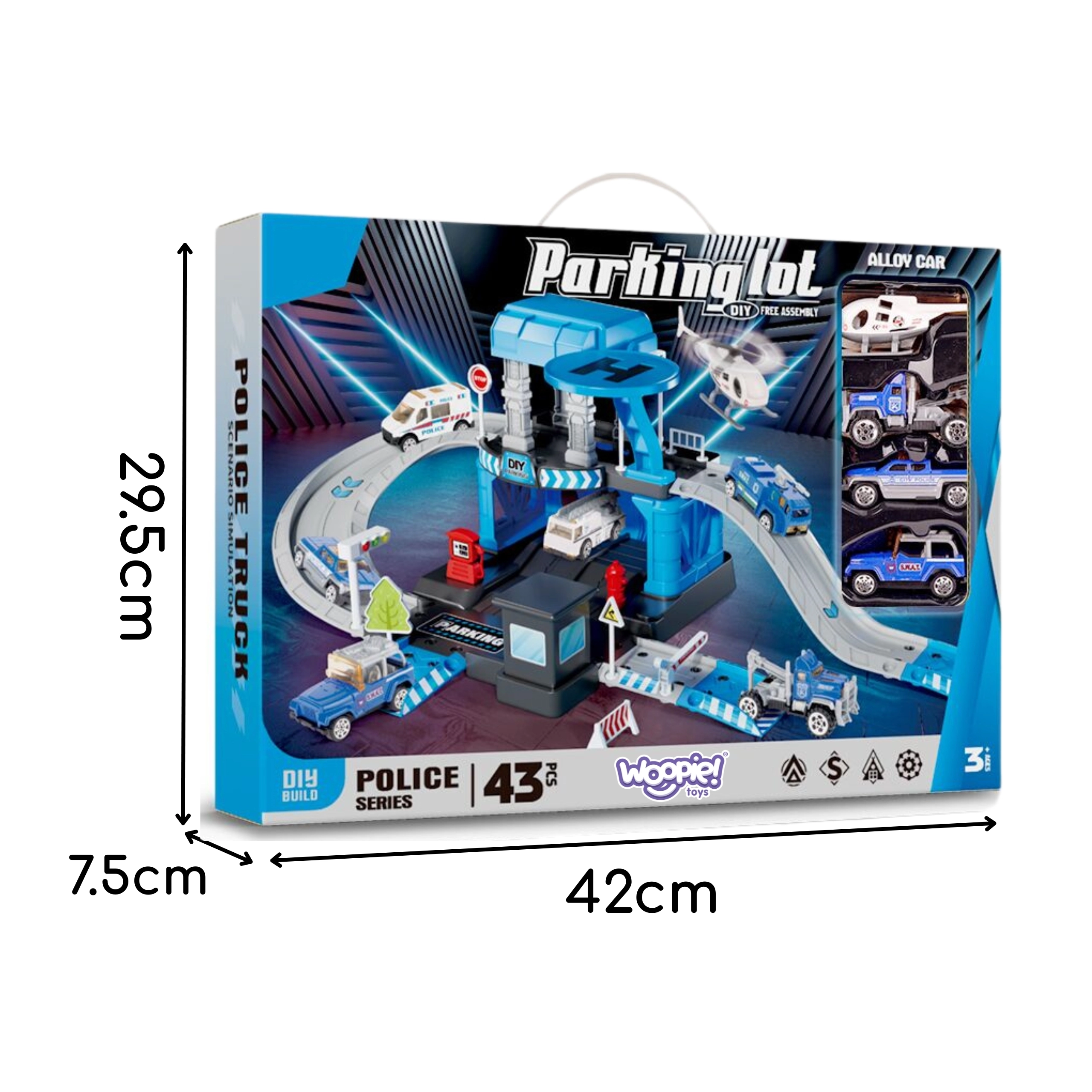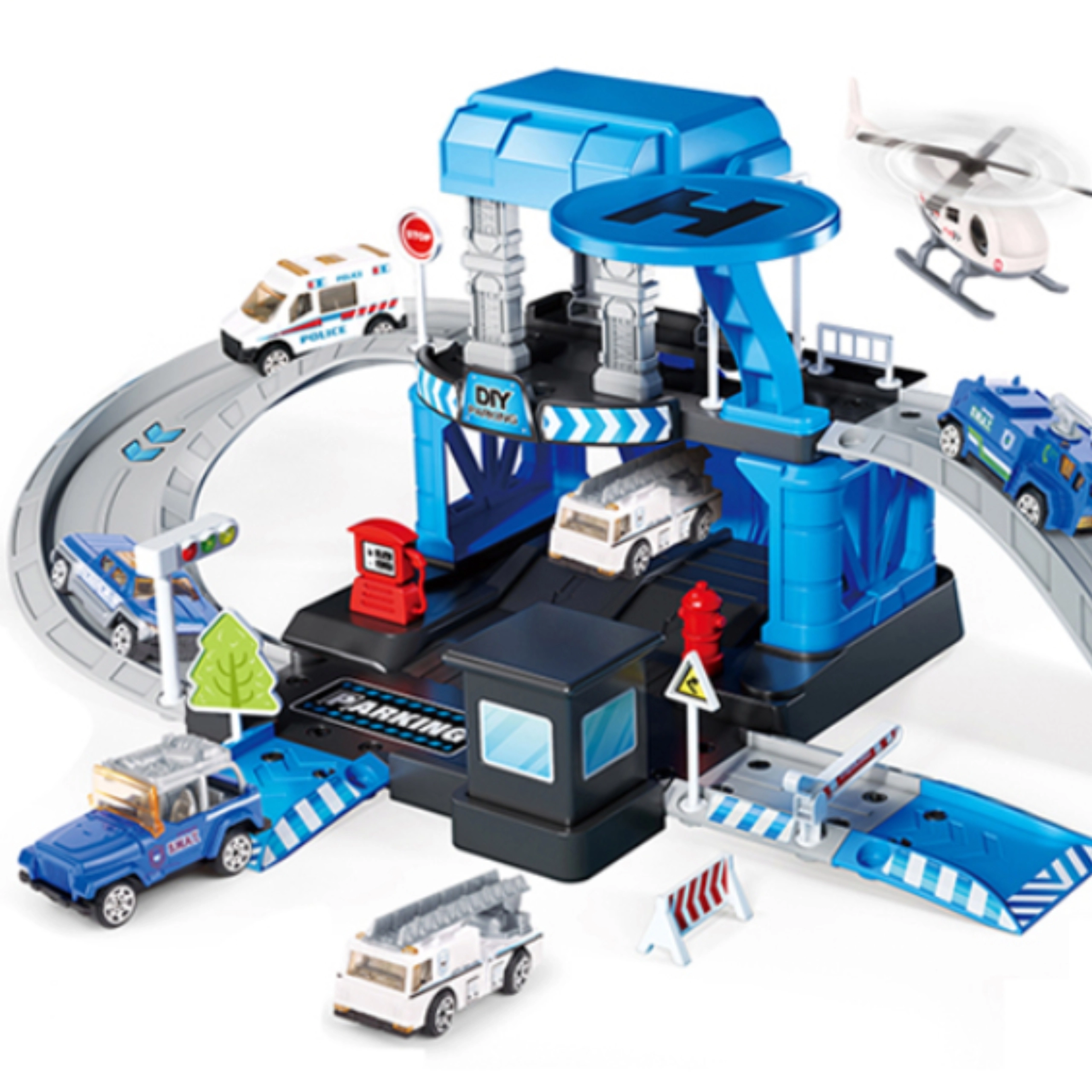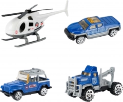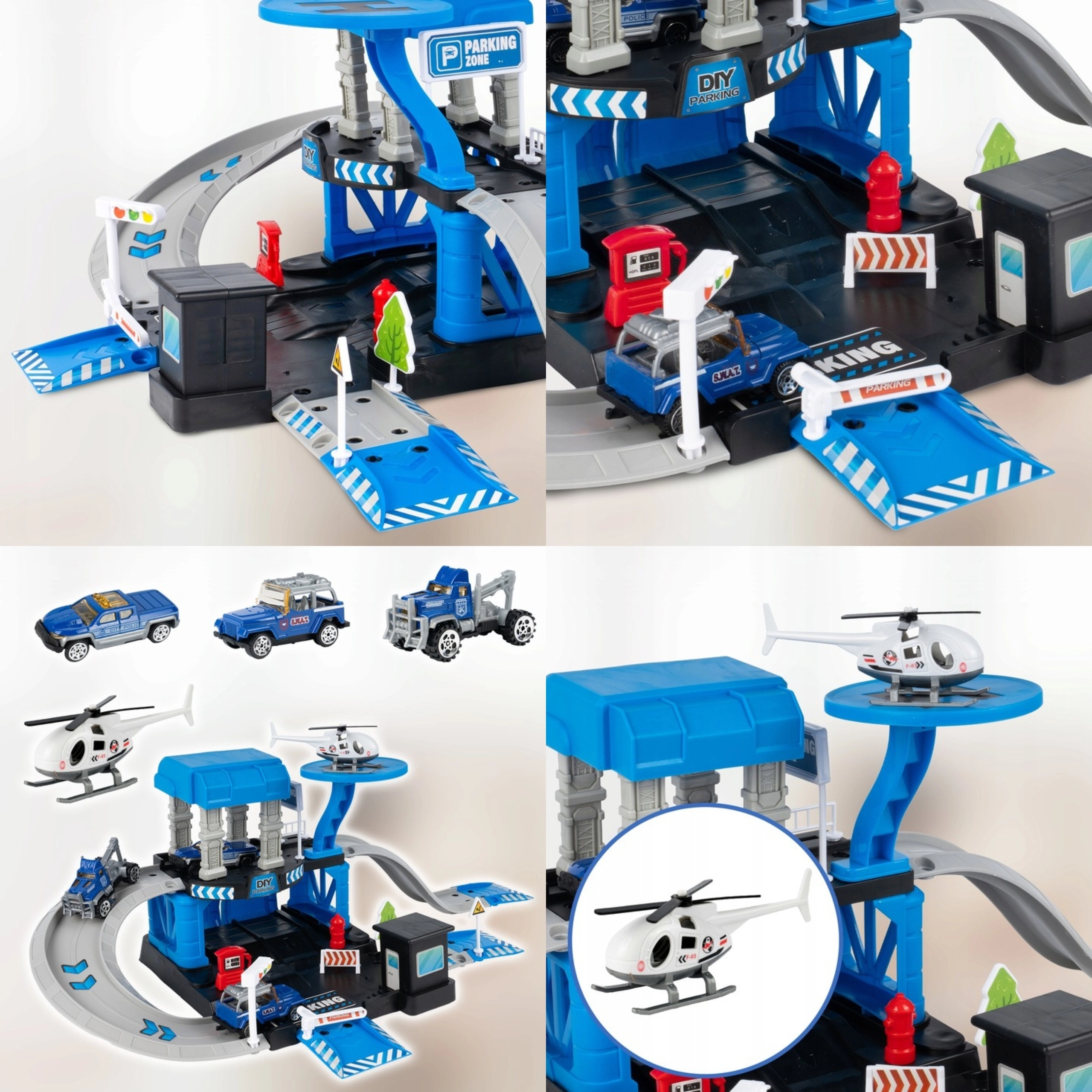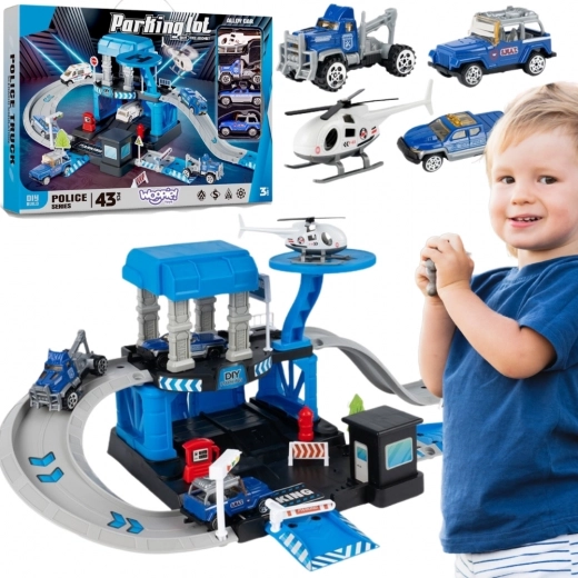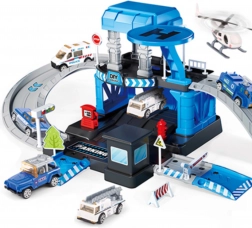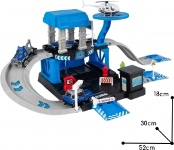 Priloženi so 3 kovinski policijski avtomobilčki (naključni modeli) in policijski helikopter, zato se bodo otroci zabavali sami ali s prijatelji. Čvrsta konstrukcija iz trpežne plastike in žive barve zagotavljajo varno in privlačno zabavo od 3. leta dalje.