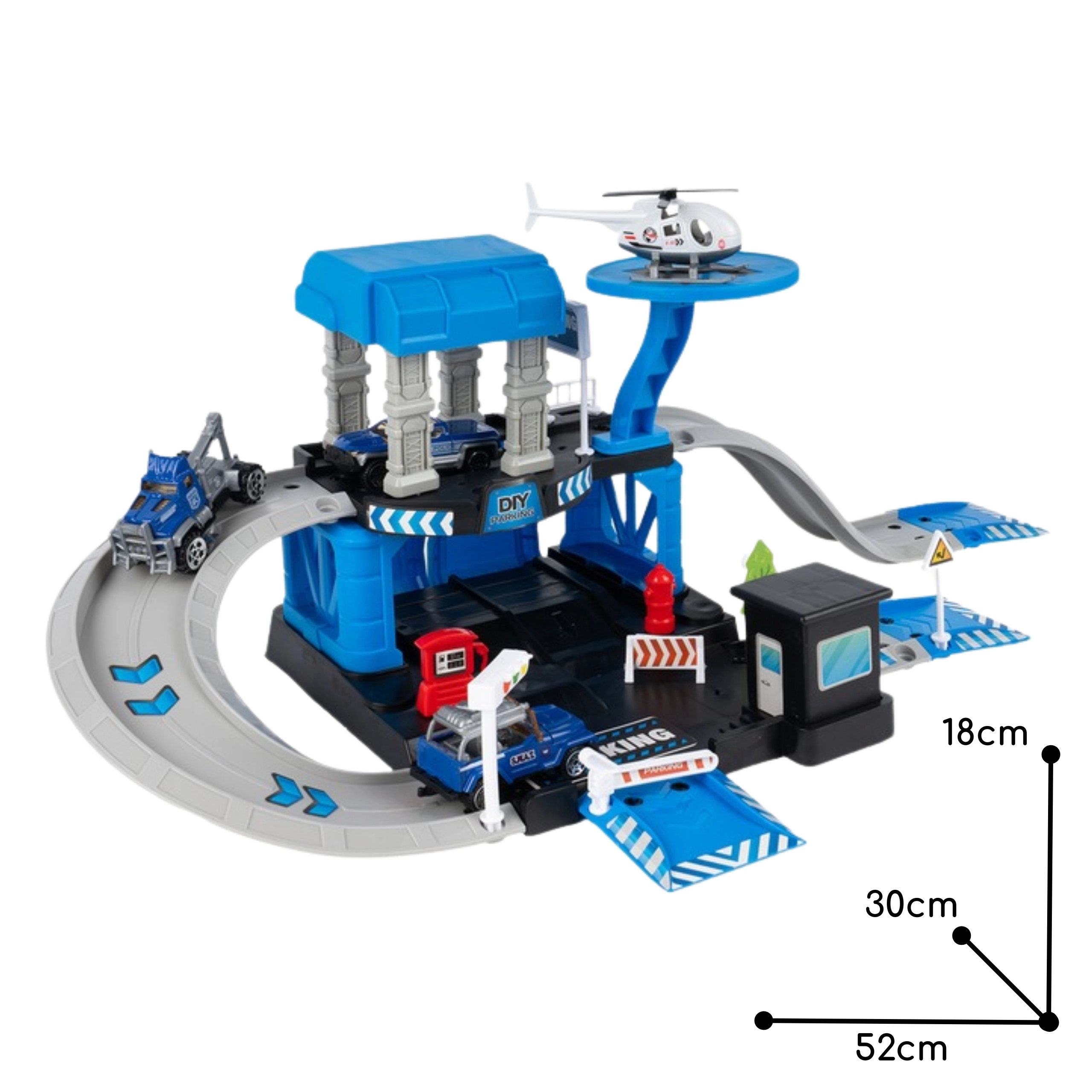 Ustvarite svoje policijsko mesto! Ta dvonadstropni parkirni kompleks s komisariatom prinaša rampe, spuste in pristajalno ploščad za helikopter. Zahvaljujoč realističnim podrobnostim, kot so bencinska postaja, zapornice, prometni znaki, semaforji in stražarska hišica, bodo otroci zlahka ustvarili nešteto zgodb in misij.