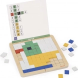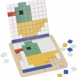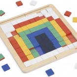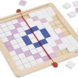 Ta lesena izobraževalna mozaika povezuje igro in učenje: otroci polagajo barvne ploščice v mrežo po predlogah, zrcalno dopolnjujejo manjkajoče polovice slik in odkrivajo skrite motive s pomočjo barvnih in številskih kod. Zahvaljujoč sistematičnemu postopku si naravno razvijajo logično razmišljanje, vizualno zaznavanje in fino motoriko.
