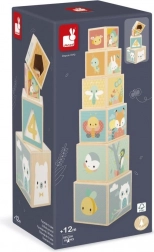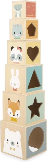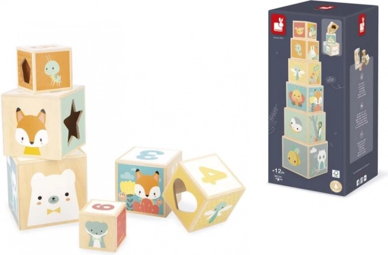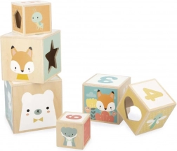 Ta lesena piramida iz 6 kock navduši z nežnimi barvami in ljubečimi ilustracijami. Otroci lahko kocke zlagajo, razvrščajo in premetavajo, s čimer bolje razumejo principe ravnotežja, velikosti in prostora. Vsaka kocka ima 5 različnih strani: ljubko žival, žival v okolju, majhno žival na barvnem ozadju, številko za prve korake v štetju in izrezano obliko, ki ob združitvi dveh kock razkrije vesel motiv (na primer mucka v srcu).
