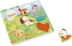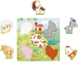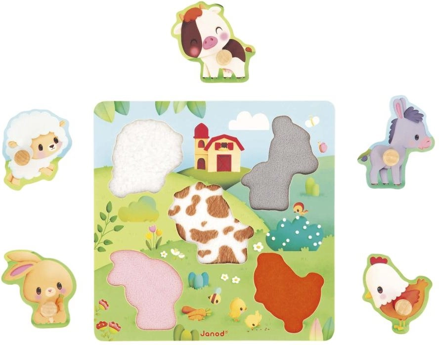 Ta kakovostna lesena vstavljanka otrokom prinaša ne le veselje do igre, temveč tudi čutno odkrivanje. Pod petimi delčki se skrivajo tipne teksture, ki posnemajo dlako ali kožo prikazanih živalic ter spodbujajo senzorični razvoj in naravno radovednost.