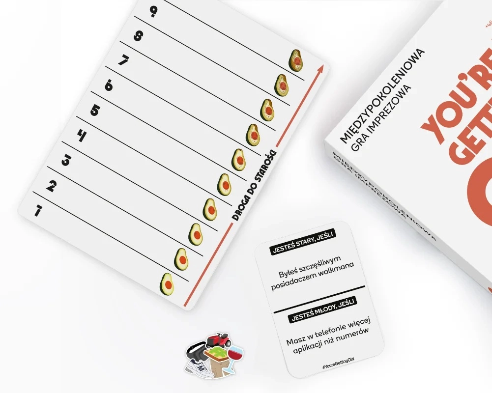 »You’re Getting Old« je izvirna kartna igra, ki vsak večer s prijatelji spremeni v salvo smeha. Vlecite karte z izjavami o tem, kaj je »mlado« in kaj že »stara šola«, ter glede na lastne reakcije napredujte po plošči naprej ali nazaj. Zmaga tisti, ki se ne pusti potegniti proti cilju in ostane čim bližje začetku.