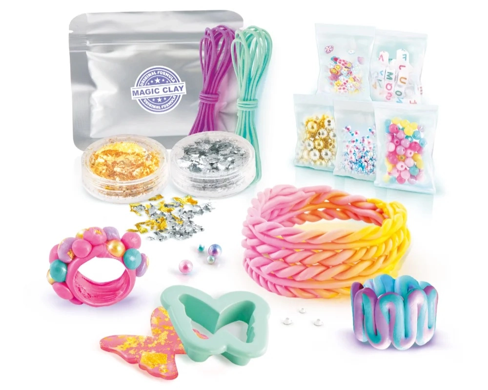 - 4 vrečke modelirne mase v različnih barvah; 5 vrečk z perlicami in okraski; 1 list z vzorci za odtis; 2 steklenički z dekorativno folijo; 2 vrvici; 2 kalupa; navodila in inspiracijska kartica