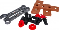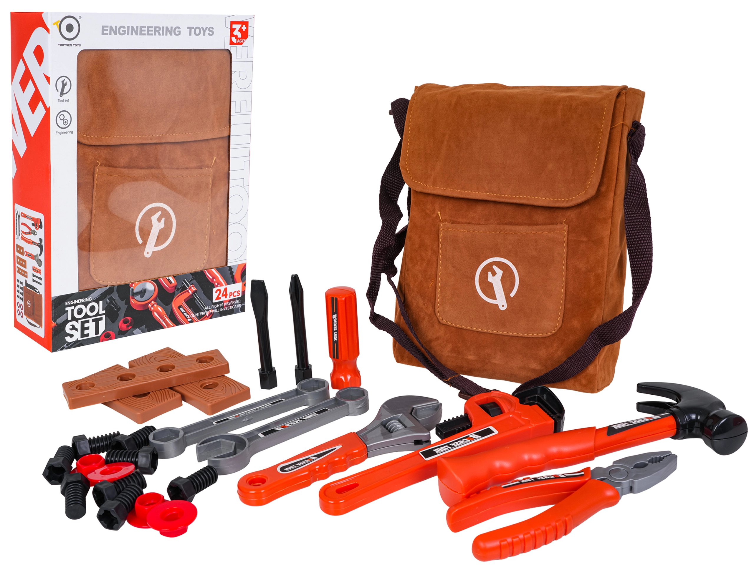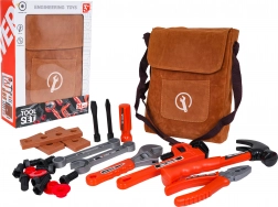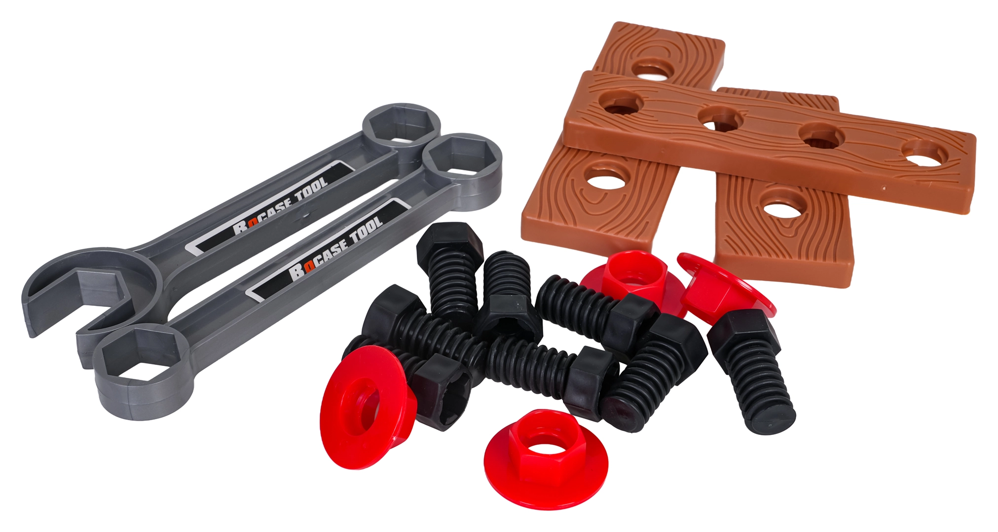 V pakiranju najdete vse potrebno: kladivo, klešče, vodovarske klešče, nastavljivi ključ, izvijač z zamenljivimi nastavki, vijake, matice ter »lesene« letvice z odprtinami za vadbo. Deli so zasnovani za majhne otroške roke z poudarkom na udobnem oprijemu in varni uporabi.