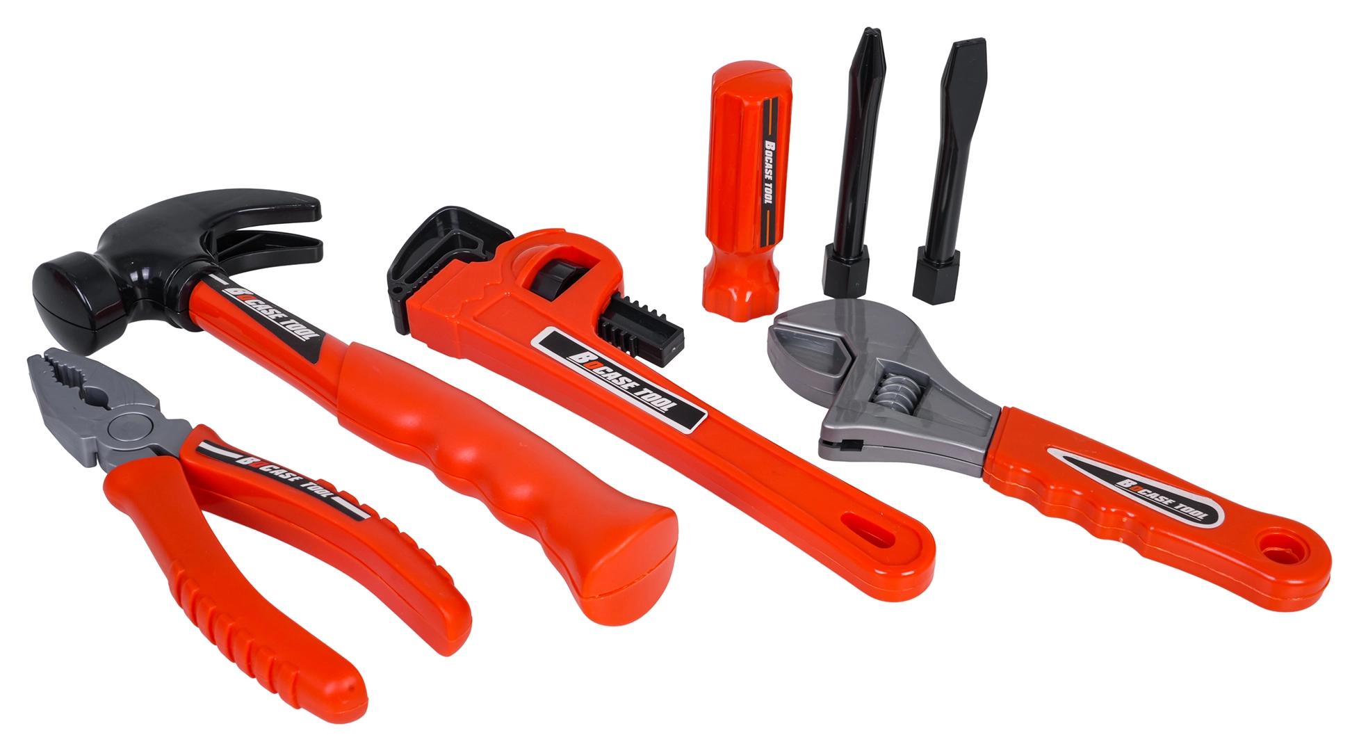 Kladivo, klešče, francoski ključ, izvijač z nastavki in vodovarske klešče izgledajo kot prava orodja, vendar so lahka in varna za otroške roke.