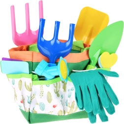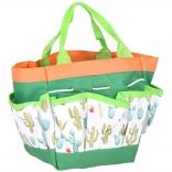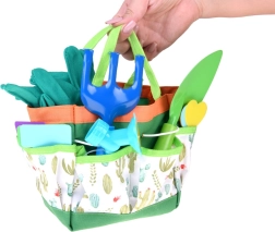 Celovit otroški vrtnarski komplet z veselým motivom kaktusov spodbuja otroke k učenju in igri na svežem zraku. Vključuje praktično torbo–organizator z žepi, barvito orodje za majhne ročice, zalivalko, predpasnik, rokavice, ščitnike in barvite označevalnike rastlin. Idealno za kopanje, rahljanje, presajanje in zalivanje ter za gradnjo odnosa do narave.