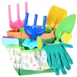 - predpasnik, 2 ščitnika, 1 par rokavic, torba–organizator, lopatka, sadilni nožek, grabljice, kultivator, zalivalka, nastavek 2v1 za plastenko, 6× označevalnik rastlin