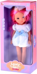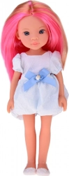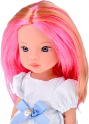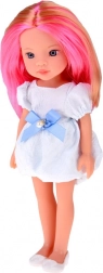 Elegantne bele obleke z modro pentljo in detajlom v videzu bisera dopolnjujejo bele balerinke. Realistične poteze obraza in sijoče oči jo naredijo za prikupno družabnico vsak dan in čudovito dekoracijo otroške sobe.