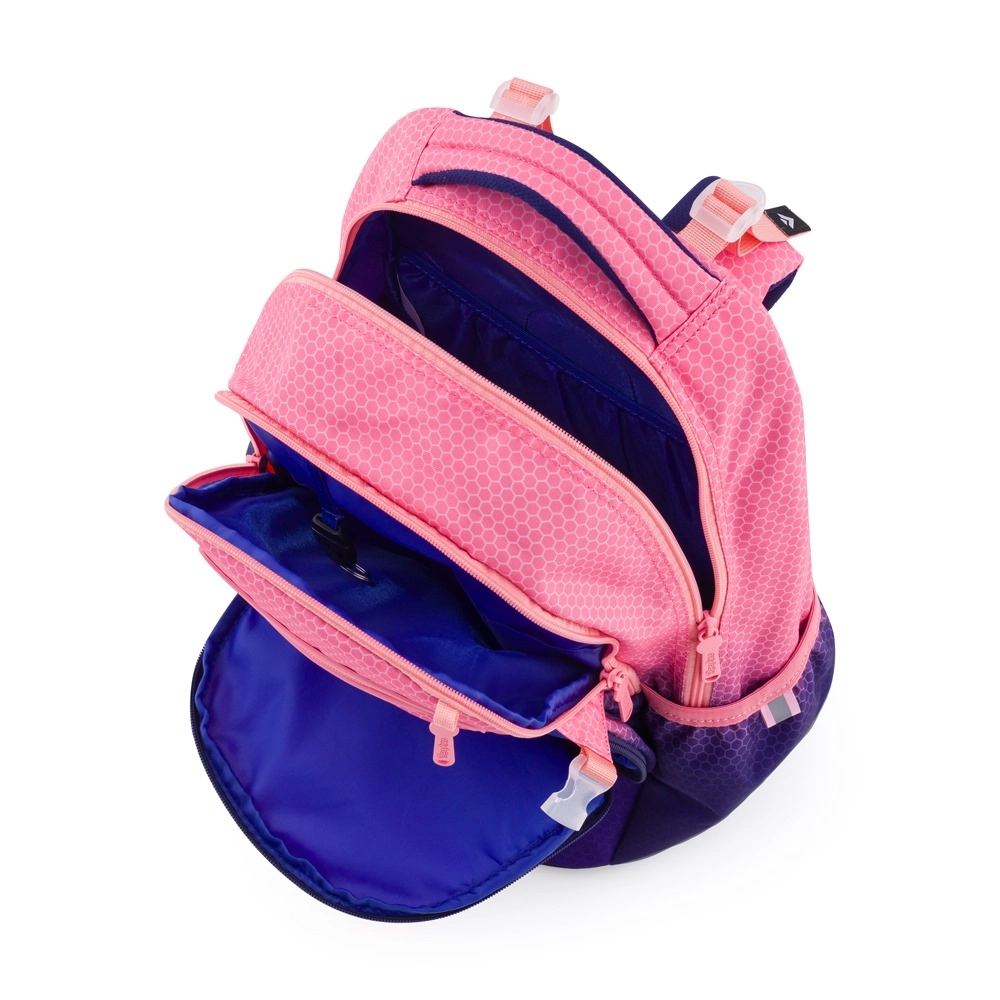 Dva velika predala sprejmeta učbenike, zvezke in peresnico, medtem ko je sprednji žep idealen za manjši prigrizek ali ključe. Stranska elastična žepa udobno sprejmeta steklenico za pijačo. Čvrsto dno preprečuje prevrnitev in omogoča, da nahrbtnik stoji samostojno. Ne manjkajo niti odsevni elementi za boljšo vidnost v mraku in temi.