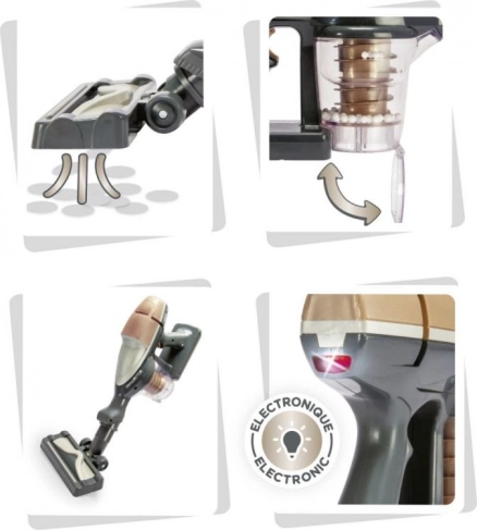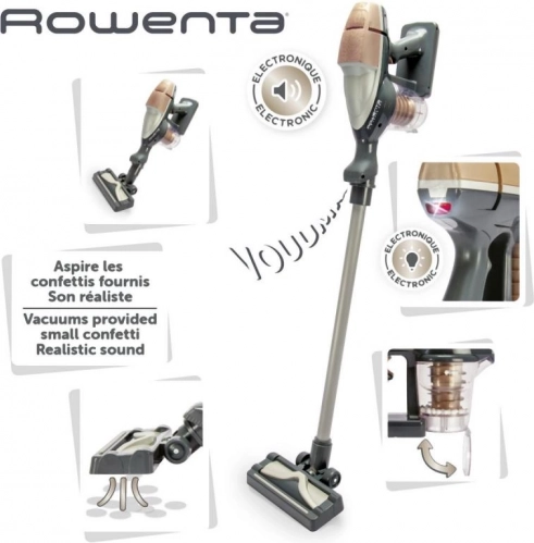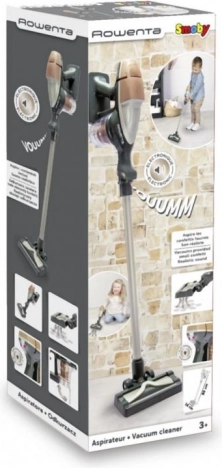 Stilski otroški pokončni sesalnik, navdihnjen po modelu ROWENTA Air Force 360, otrokom prinaša realističen občutek pospravljanja. Ob pritisku na gumb se prižge LED kontrolka, zasliši se pristen zvok sesanja in aktivira se blago prisesavanje. Prozorni vsebnik z vrtinčastimi kroglicami je mogoče odpreti in izprazniti kot pri pravem aparatu. Možnost uporabe tudi kot ročni sesalnik spodbuja ustvarjalno igro.