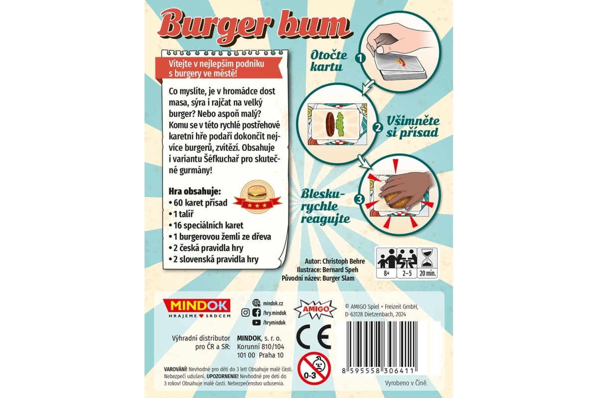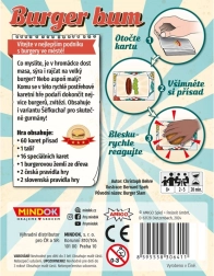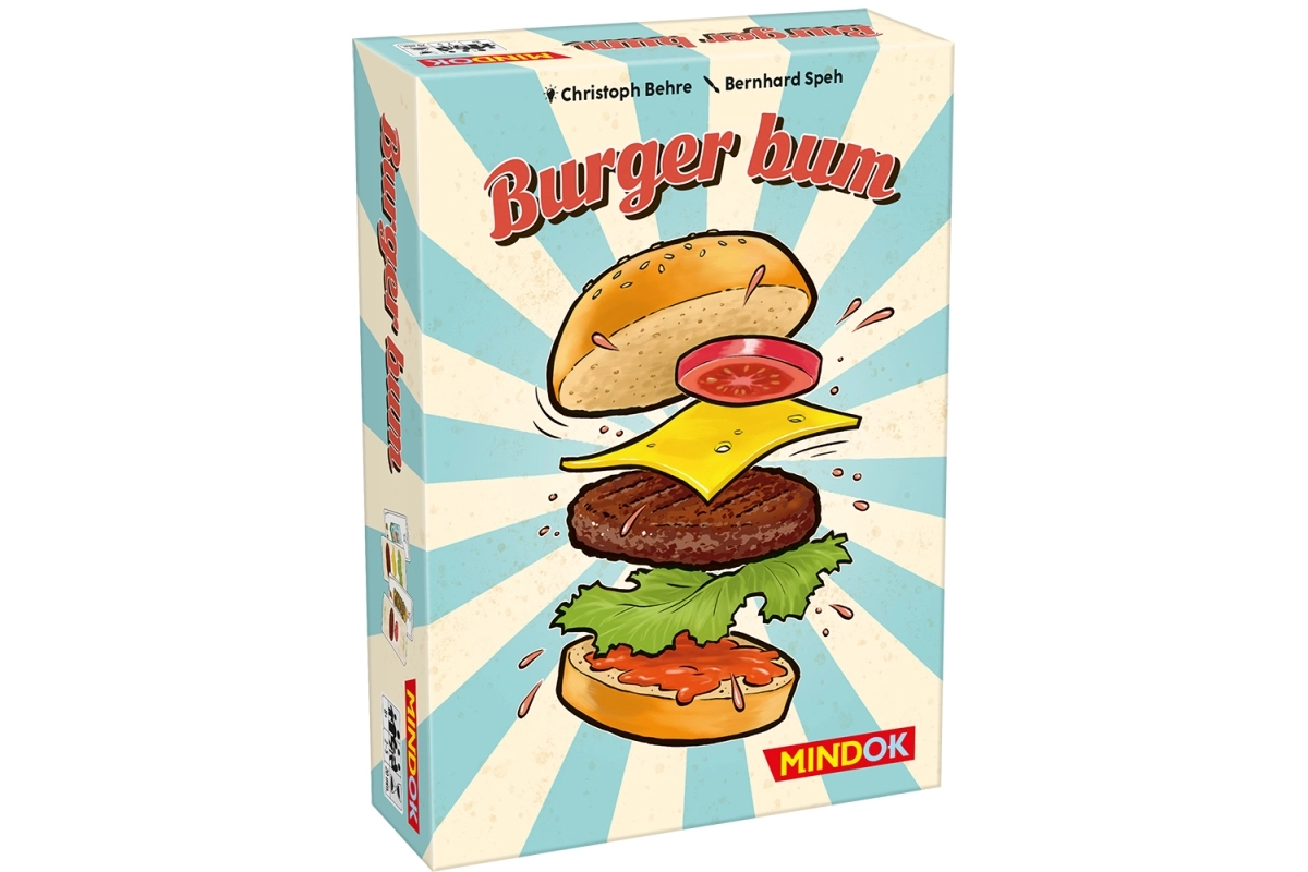 Burger Bum je živahna družinska kartna igra, v kateri iz kart sestavin pripravljate okusne burgerje. Zmaga tisti, ki ima na koncu igre največ kart v kupčku – ključni so hiter odziv, pozornost in pravilno časovno odmerjanje, kdaj je burger pripravljen.