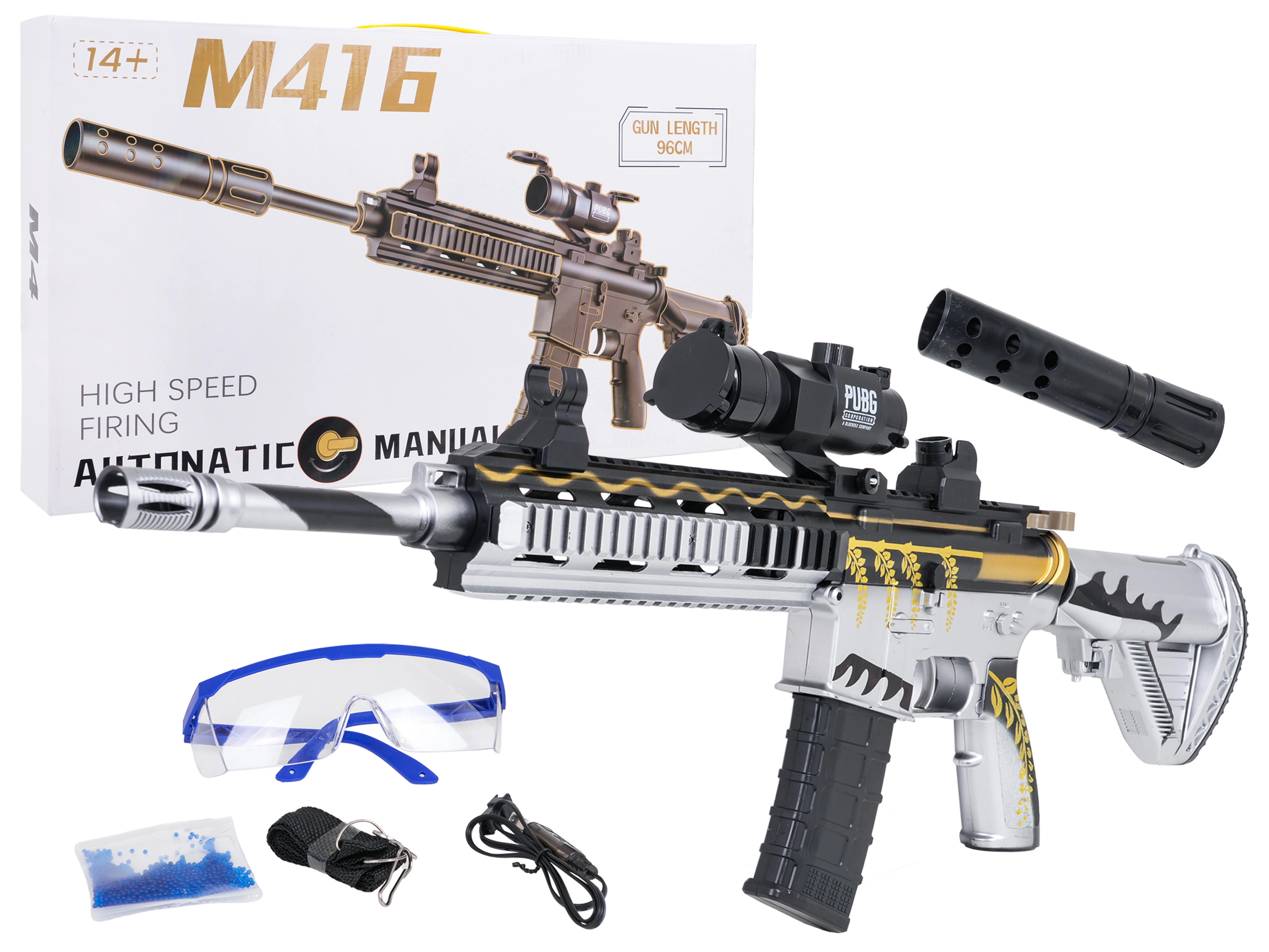 Velika gel pištola M416 v trendno sivi barvi za zabavno streljanje z vodnimi kroglicami premera 7–8 mm. Ponuja ročni in avtomatski način streljanja, nastavljiv merek z lupo ter napajanje z akumulatorjem 7,4 V z USB polnjenjem. V paketu dobite zaščitna očala, dušilec, nabojnik, pašček in vrečko s približno 500 gel kroglicami. Idealno za zabavo za starejše otroke od 14 let.