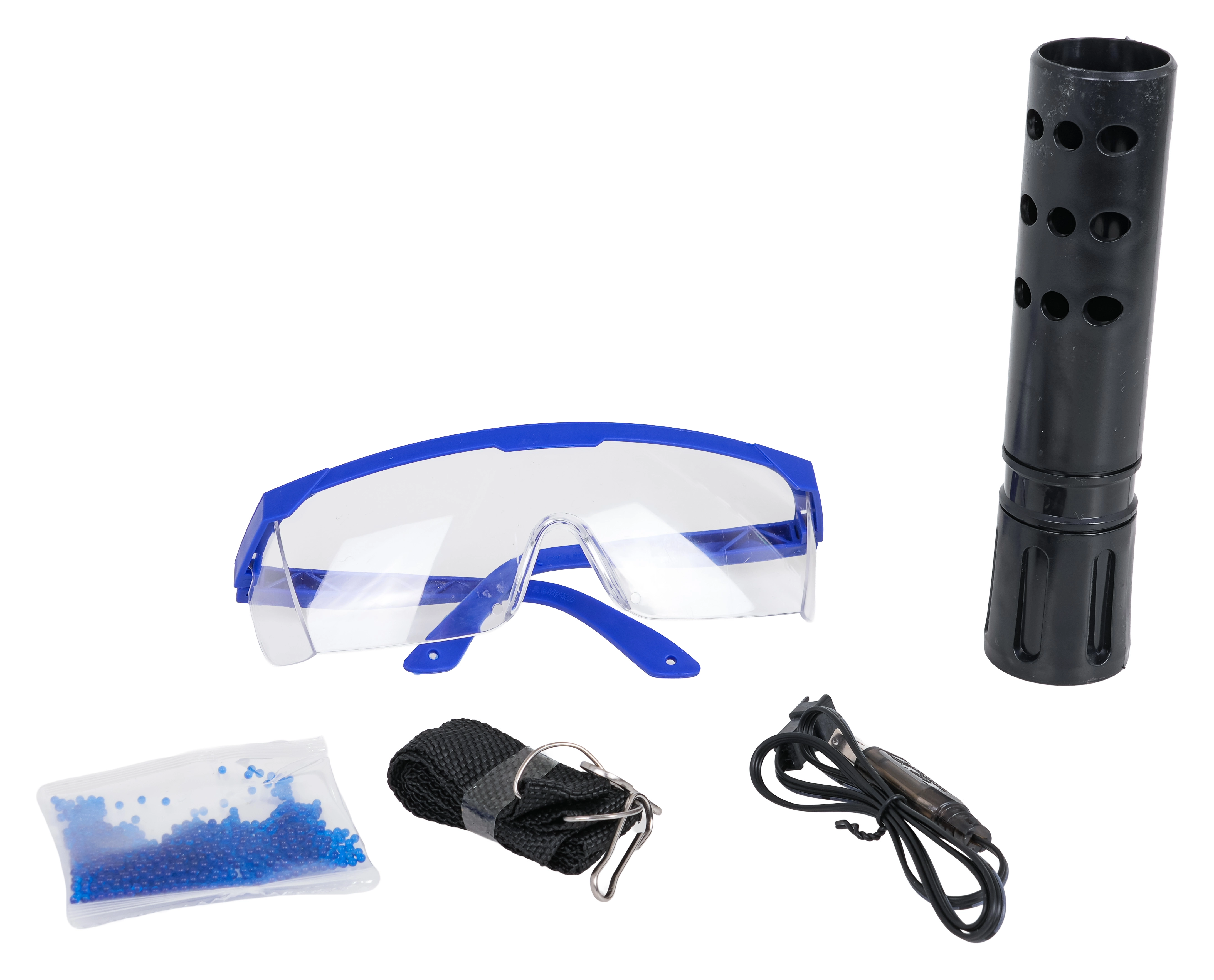 Priloženi akumulator 7,4 V zagotavlja zanesljivo delovanje in udobno USB polnjenje. V kompletu je vse potrebno za takojšen začetek – od nabojnika in dušilca do zaščitnih očal in začetnega paketa kroglic. Hidrogelne kroglice je treba zaliti z vodo in pustiti, da nabreknejo približno 4–6 ur, nato odliti odvečno vodo in že ste pripravljeni na akcijo.