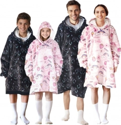 Praktične podrobnosti, kot sta velika kapuca in prostoren kengurujski žep, ohranjajo glavo in roke tople. Odeja-jopica ima univerzalno otroško velikost z dolžino do kolen in je primerna za otroke od 7 do 12 let. Preprosto vzdrževanje v pralnem stroju olajša vsakodnevno uporabo.