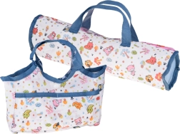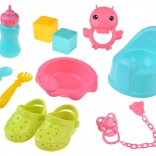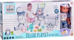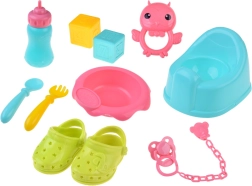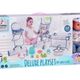 Praktična oprema vključuje jedilni set (skodelico, pribor in stekleničko), kahlico, dudo z verižico, barvne kocke in ropotuljico. Potovalna posteljica z zračnimi mrežastimi stranicami in torbo je idealna za igro in shranjevanje. Zahvaljujoč bogatim dodatkom otroci zlahka posnemajo pravo nego dojenčka ter razvijajo komunikacijo in fino motoriko.