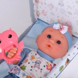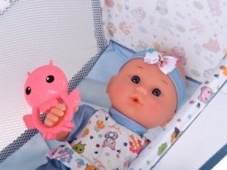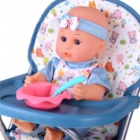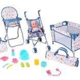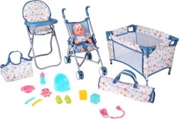 Razveselite otroke z realistnim setom za nego dojenčka, ki vključuje vse, kar je potrebno za vsakodnevne rituale – od hranjenja in sprehoda do uspavanja. Punčka ima premakljive okončine, mehka oblačila in sedi v stolčku ter vozičku. Voziček in posteljica imata lahek in zložljiv okvir, zato ju je enostavno prenašati in hitro pospraviti.