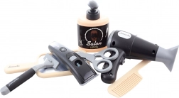 Zabaven frizerski komplet za male stiliste prinaša vse, kar je potrebno za ustvarjalno igro. Vključuje tekstilni pas, dodatke in delujoči sušilnik za lase na baterije, ki po vklopu sveti in oddaja zvoke. Idealno za razvoj domišljije in igre vlog otrok od 3 let dalje.