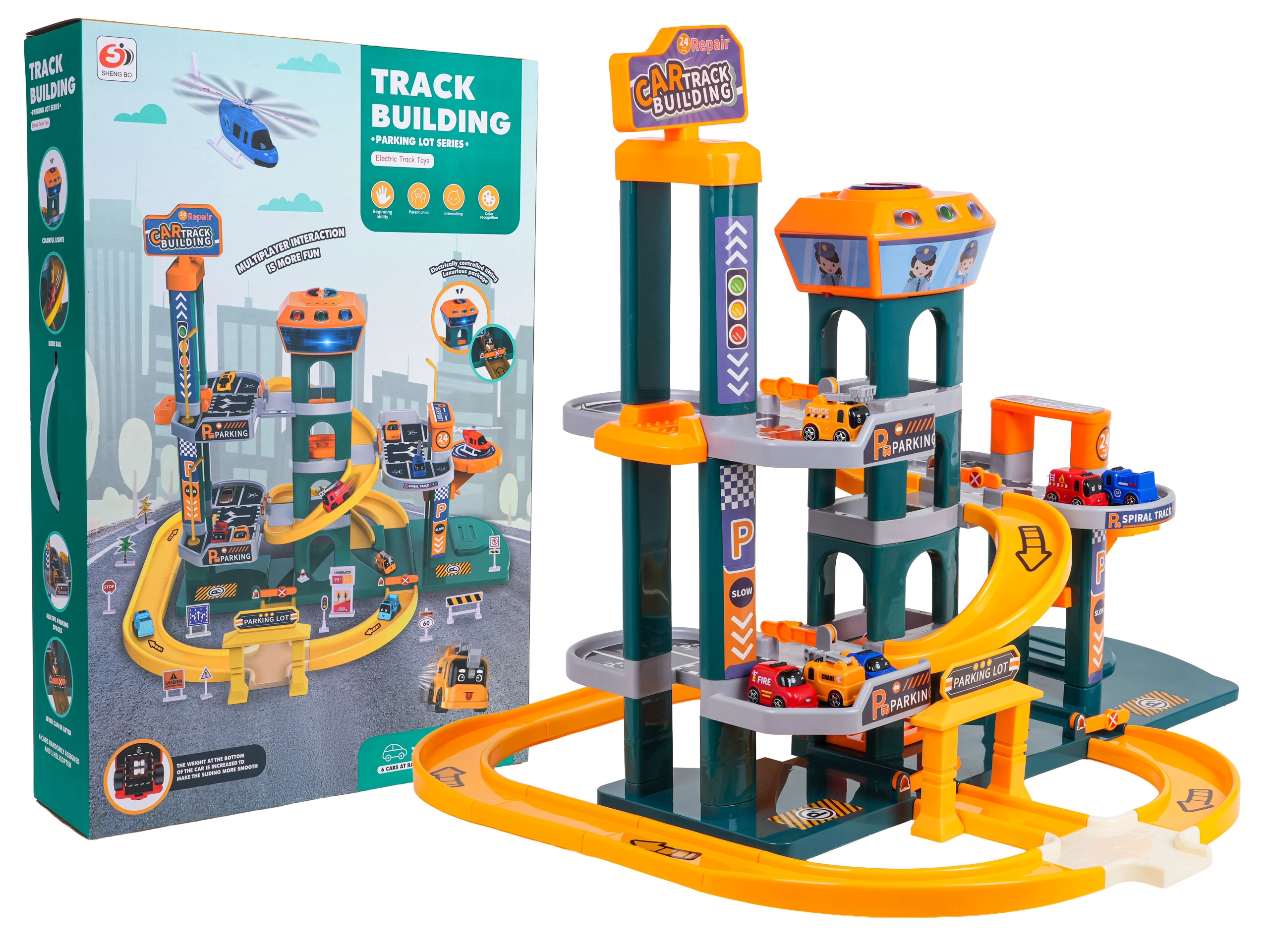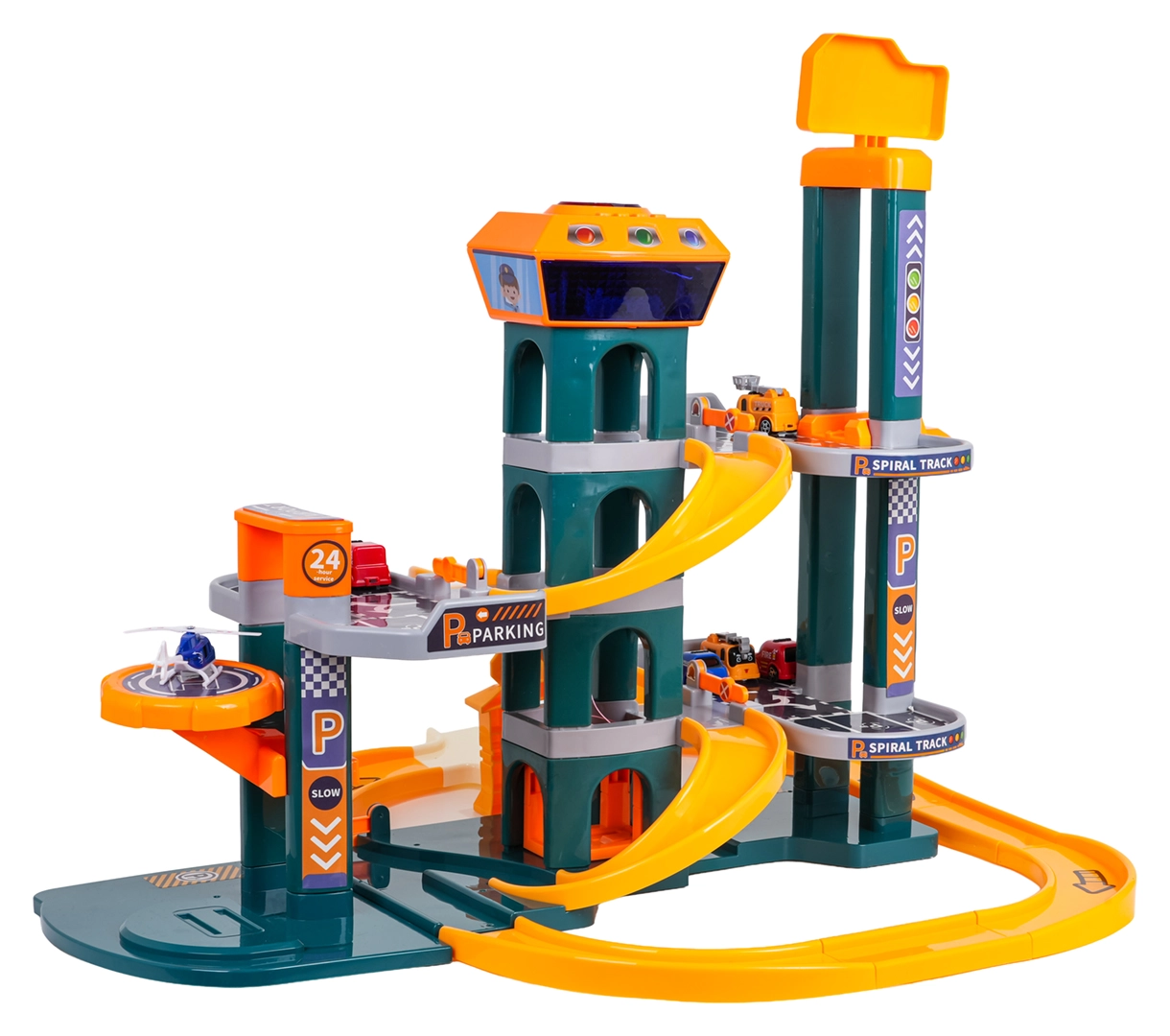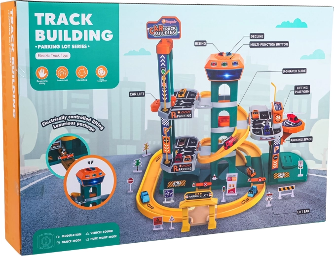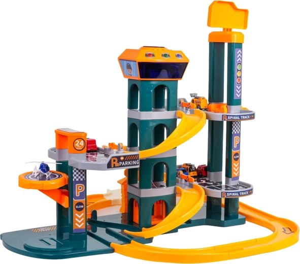 To prostorno modro parkirišče bo razveselilo male voznike s premišljeno zasnovo in stabilno konstrukcijo. Otroci lahko parkirajo na dveh ravneh, se vozijo po rampah, spuščajo po spiralni progi in uporabljajo električno dvigalo, ki ga napajajo 3× AA (niso priložene). Upravljalna plošča na vrhu stolpa dodaja interaktivnost z veselimi melodijami, zvoki siren in vozil ter utripajočimi svetlobnimi učinki.