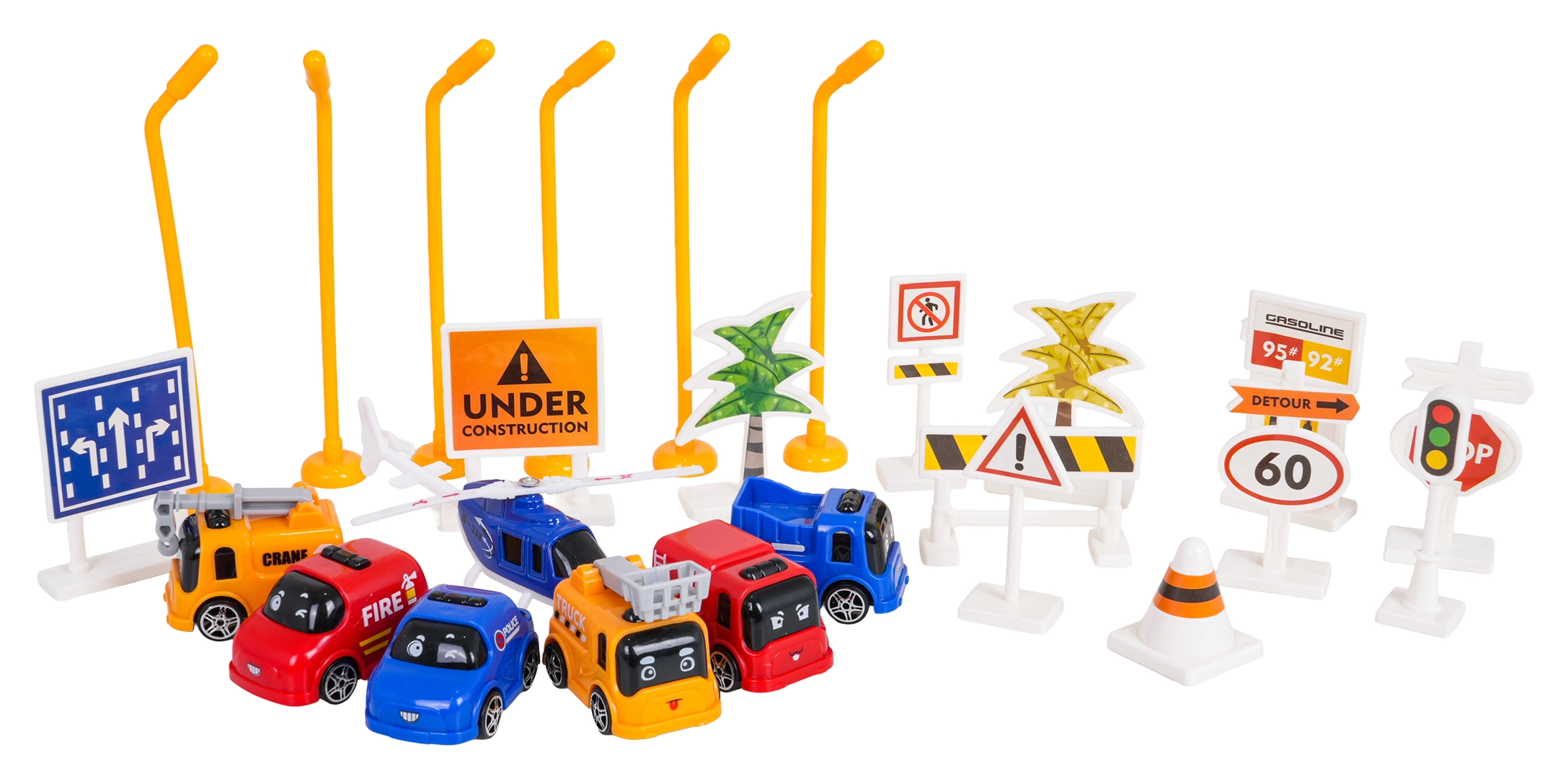 - 6× avtomobilček (2× žerjav, 2× gasilci, 2× policija), 1× helikopter, prometni znaki, zapornice, svetilke, dekorativne nalepke