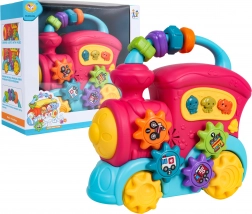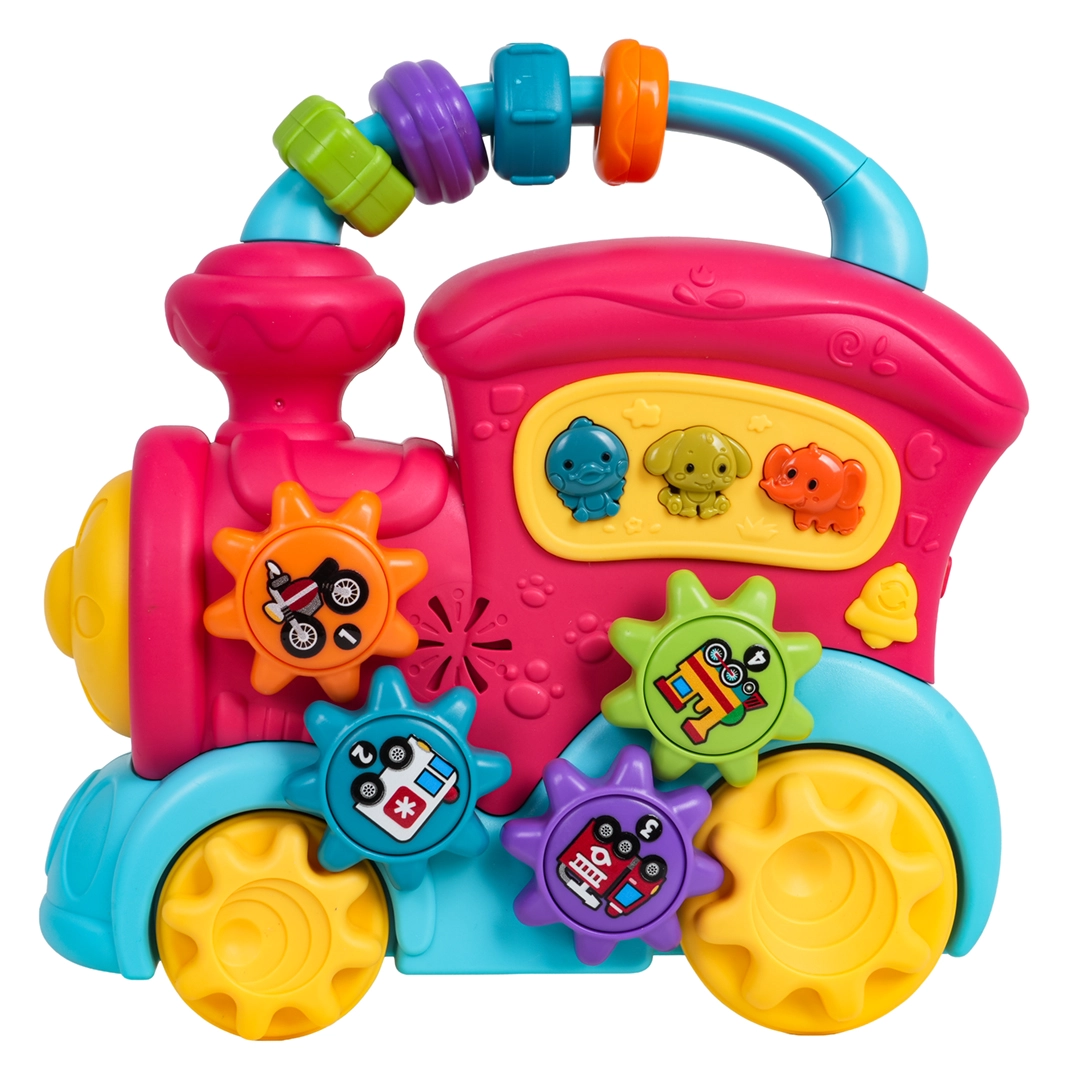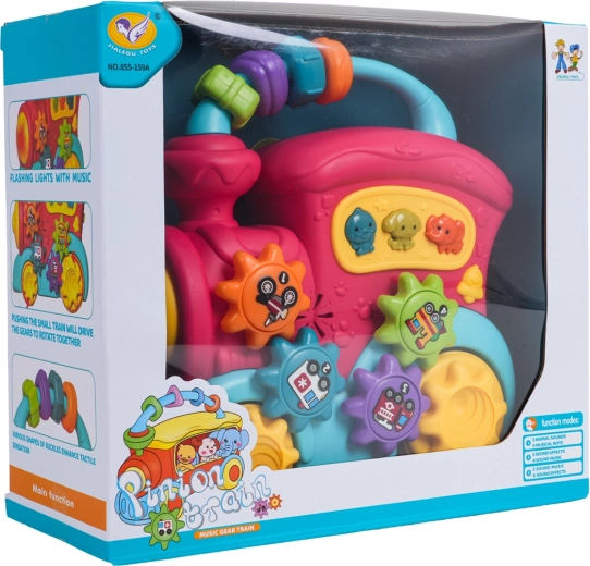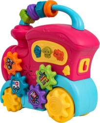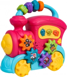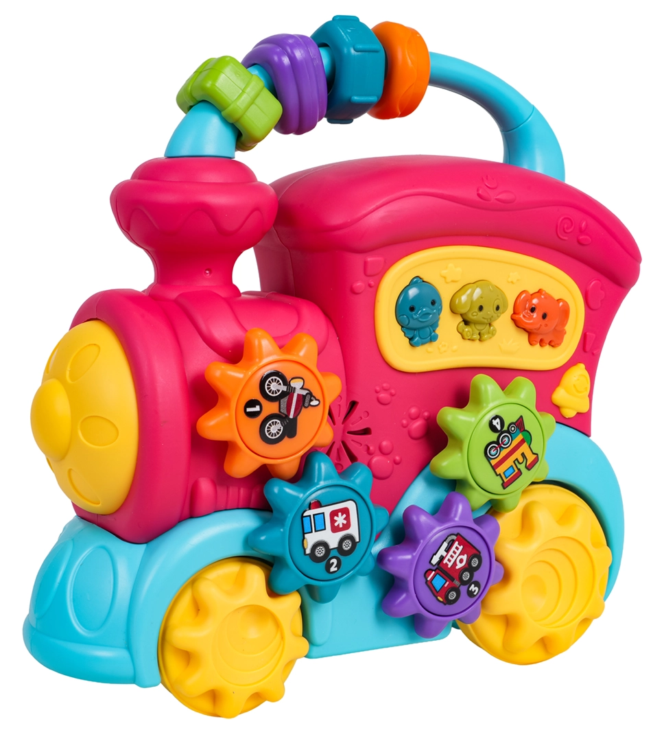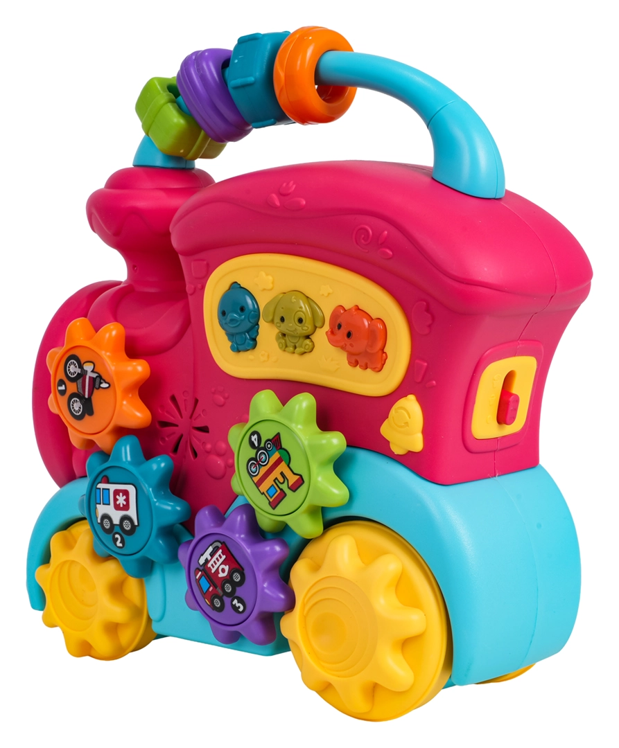 Ta barvit vlakec iz kakovostne plastike bo razveselil male raziskovalce z množico interaktivnih elementov. Na strehi najdete senzorične kroglice, na strani zobniška kolesca s slikami in gumbe z živalmi, ki ob pritisku predvajajo zvoke race, psa ali slona, vesele zvončke in melodije. Ob premikanju vlakca se zavrtijo kolesa in zobniški mehanizem oddaja prijetno rožljanje, sprednji žaromet zasveti in otrok je motiviran za nadaljnje raziskovanje.