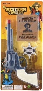 Postanite mali kavboj! Ta plastični revolver s šerifsko značko bo razveselil vse male pištolarje. Igrača oddaja klapajoči zvok, priloženi sta tudi šerifska značka in plakat »Iskan« za še več zabave. Idealna igrača za otroke od 3 let.