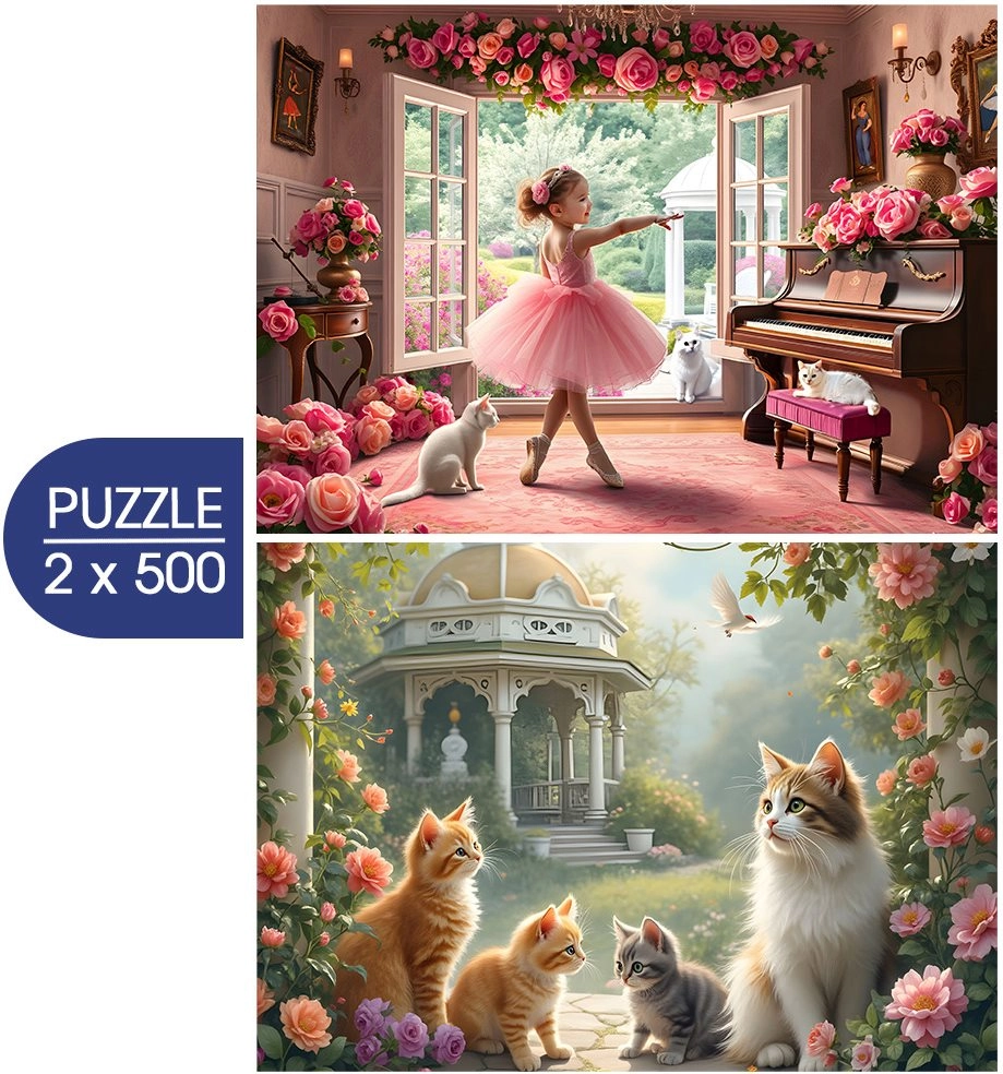 Uživajte v sprostitvi z lepo dvojico sestavljank znamke Alipson – motivi Mala balerina in Romantični vrt v pakiranju 2×500 koščkov. Kakovostna izdelava, natančno izrezani koščki in prijeten format približno 47,8 × 34,2 cm po sestavitvi zagotavljajo odlično izkušnjo za otroke in odrasle.