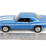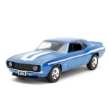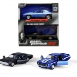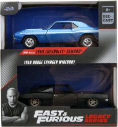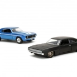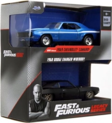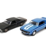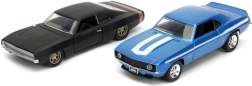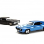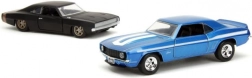 Ta stilski dvojni paket prinaša dva klasična muscle car v zbirateljski kakovosti: modri Chevrolet Camaro 1969 z belimi črtami in mat črni Dodge Charger Wide Body 1968. Realistična razmerja, čiste linije karoserije in prozorna okna poudarjajo filmsko atmosfero serije Hitri in drzni.