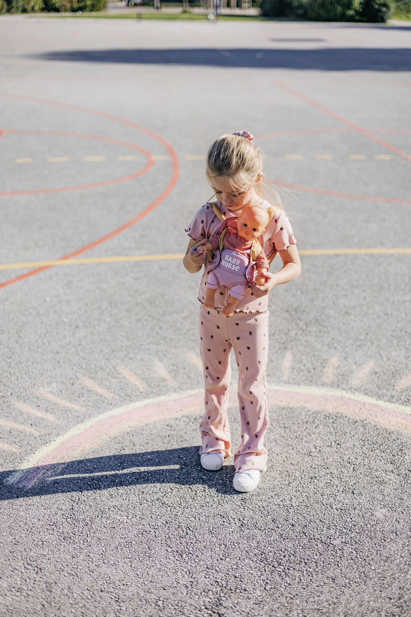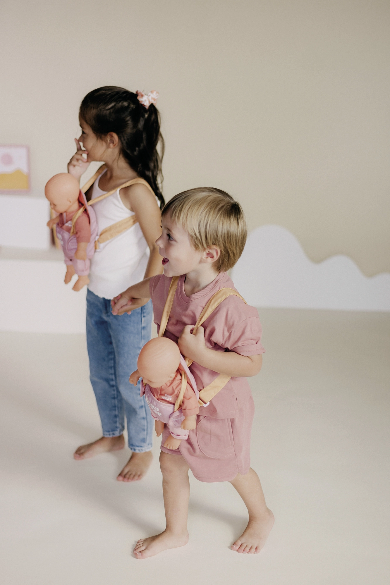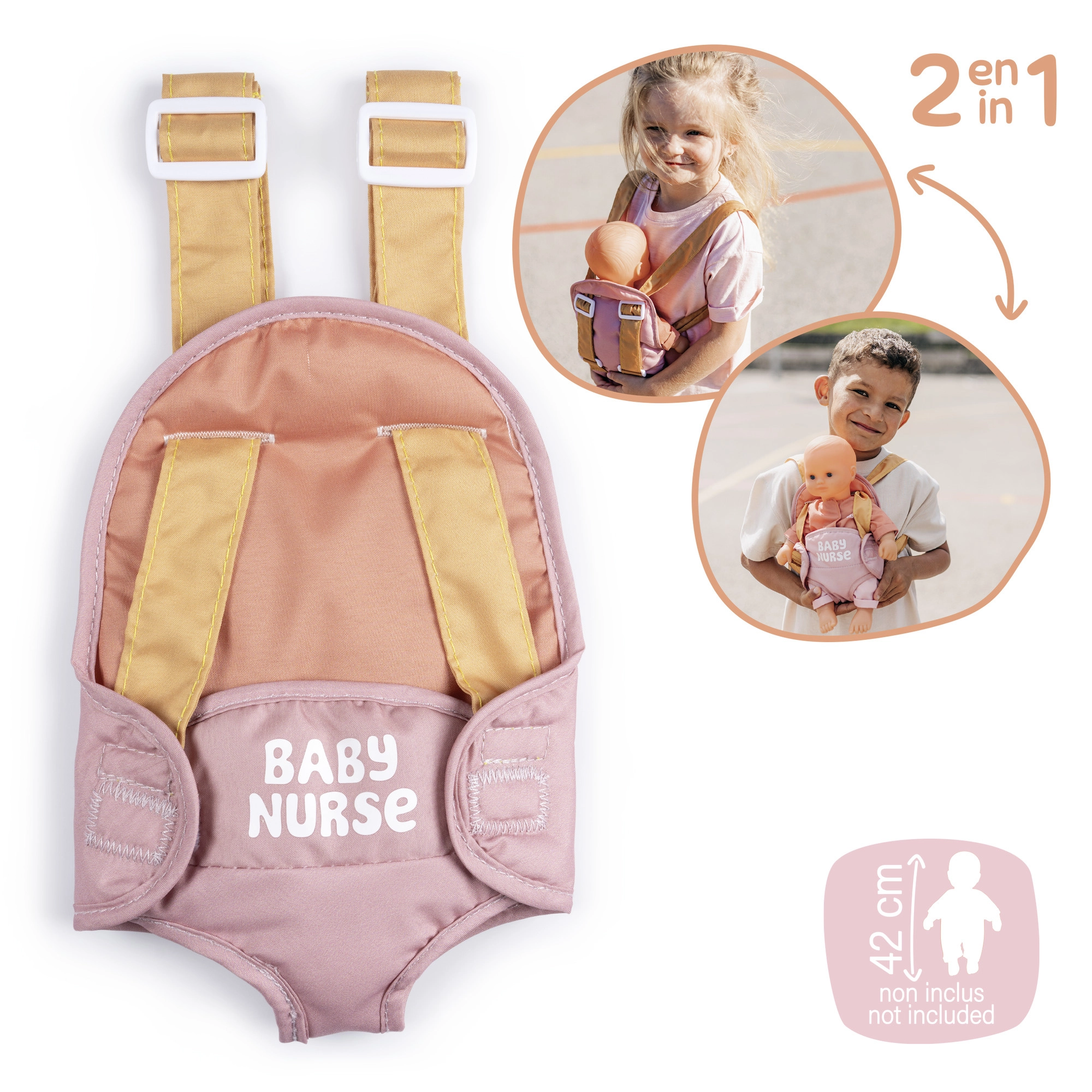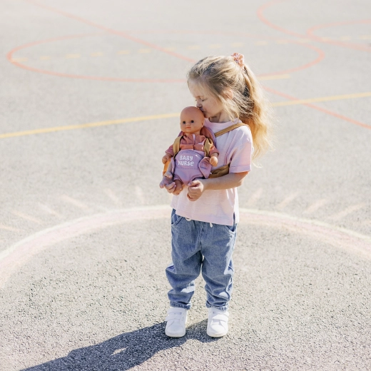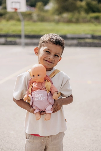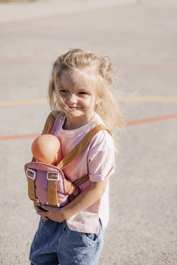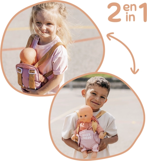 Nosilnik se preprosto prilagodi otrokovi postavi zahvaljujoč nastavljivim trakovom. Pastelna kombinacija rožnate in okraste deluje nežno in moderno, zato odlično dopolni opremo za punčke BABY NURSE.