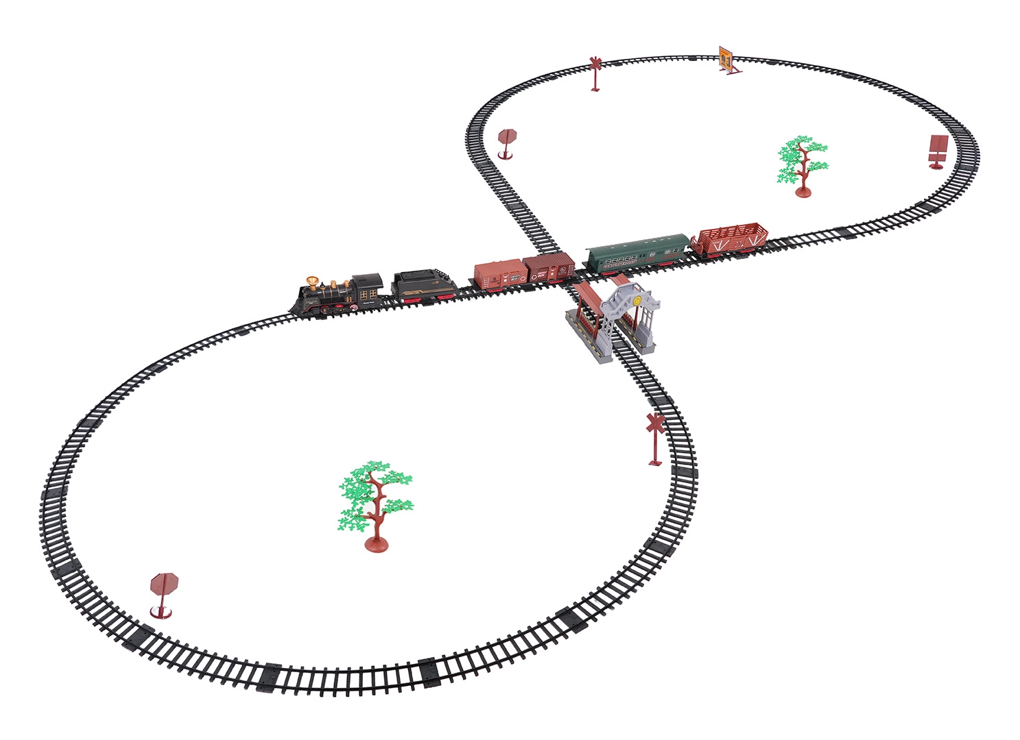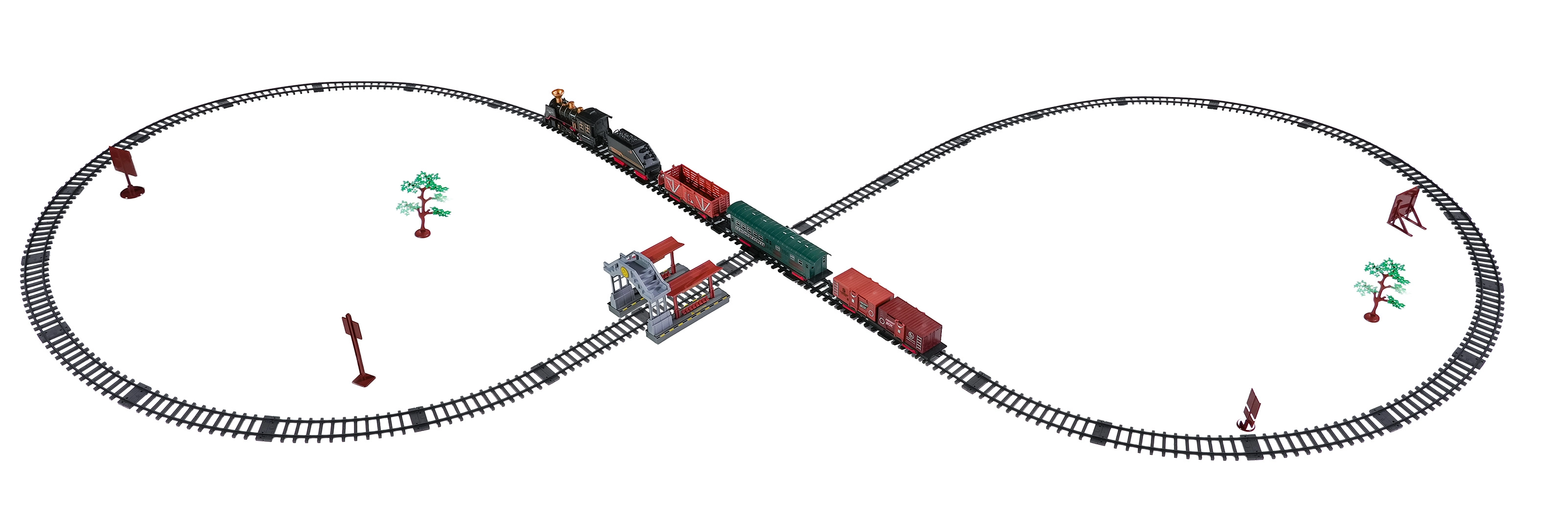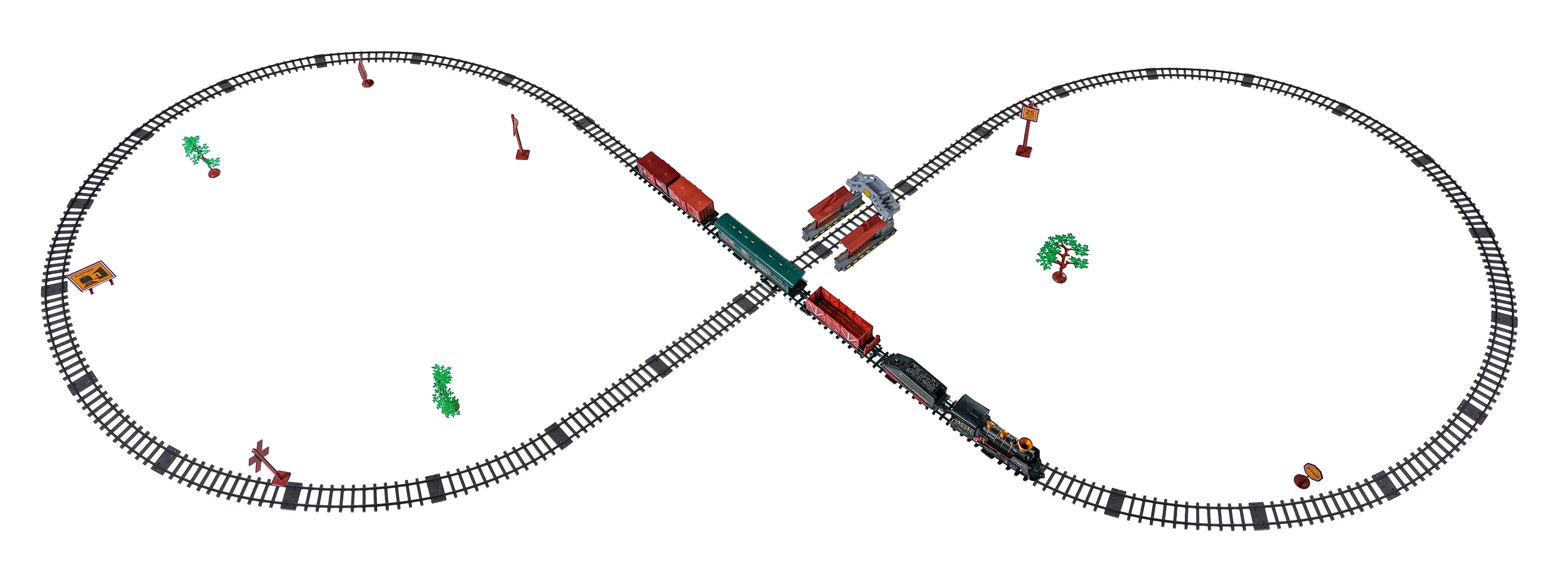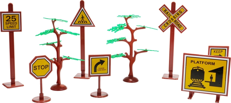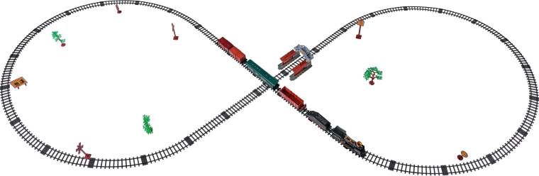V paketu najdete lokomotivo s tenderjem, potniški in tovorne vagone, prometne znake in drevesca – vse za ustvarjalno igro.