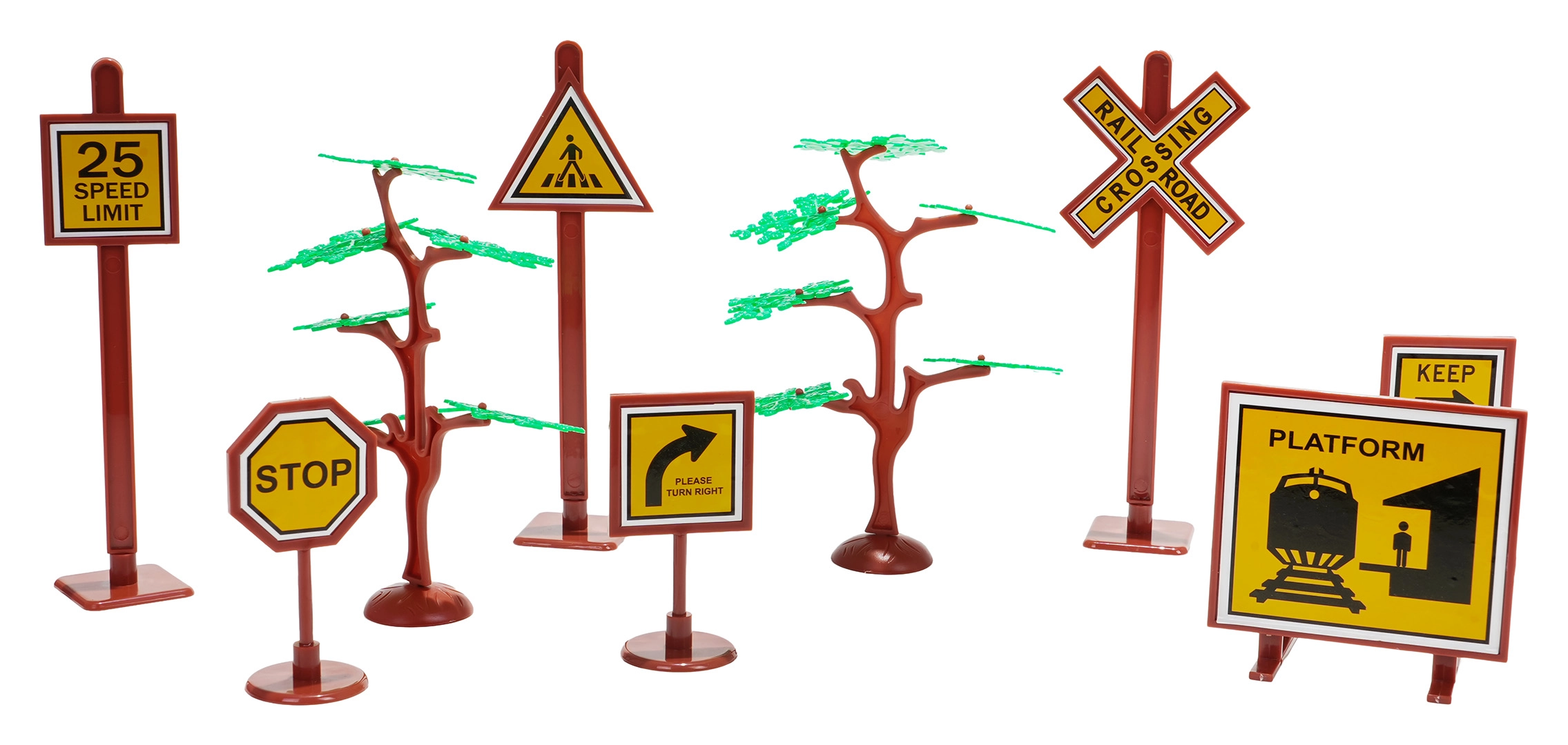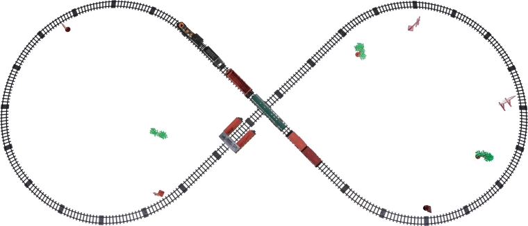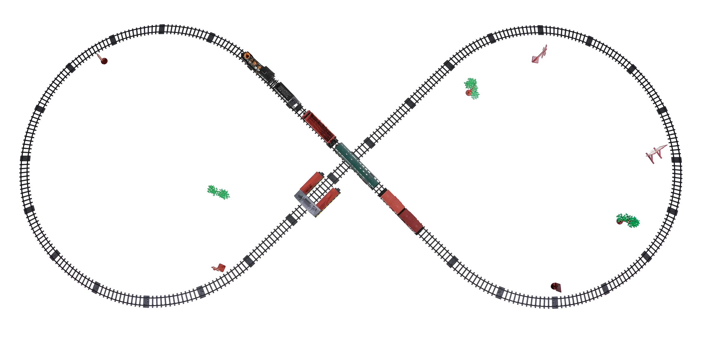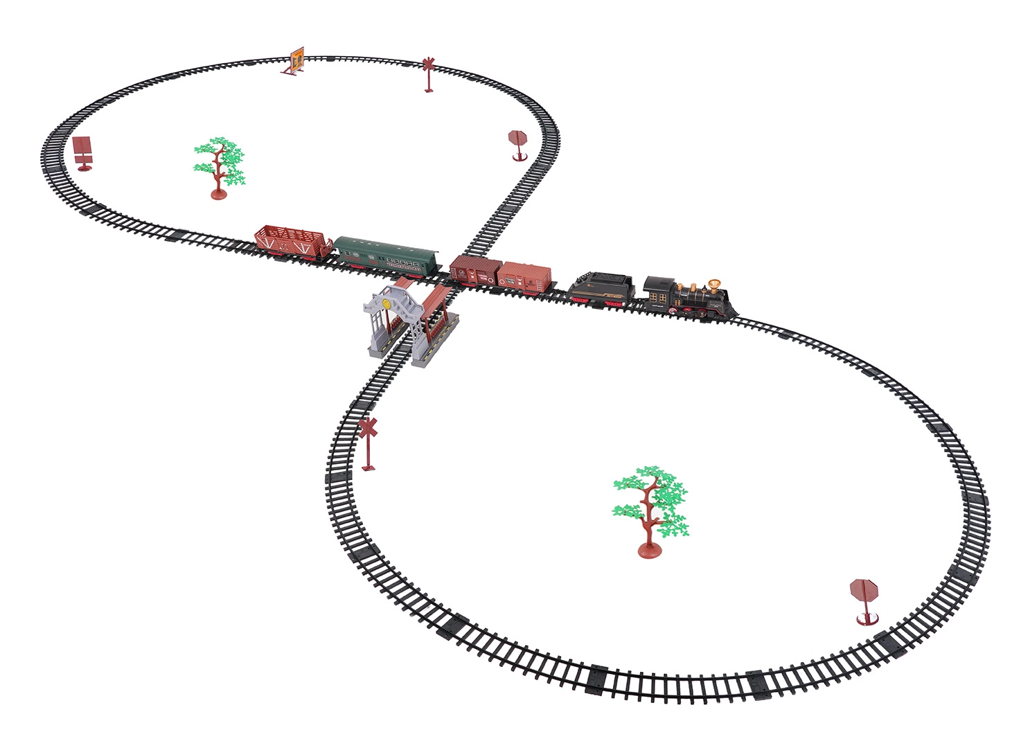 V paketu najdete lokomotivo s tenderjem, potniški in tovorne vagone, prometne znake in drevesca – vse za ustvarjalno igro.