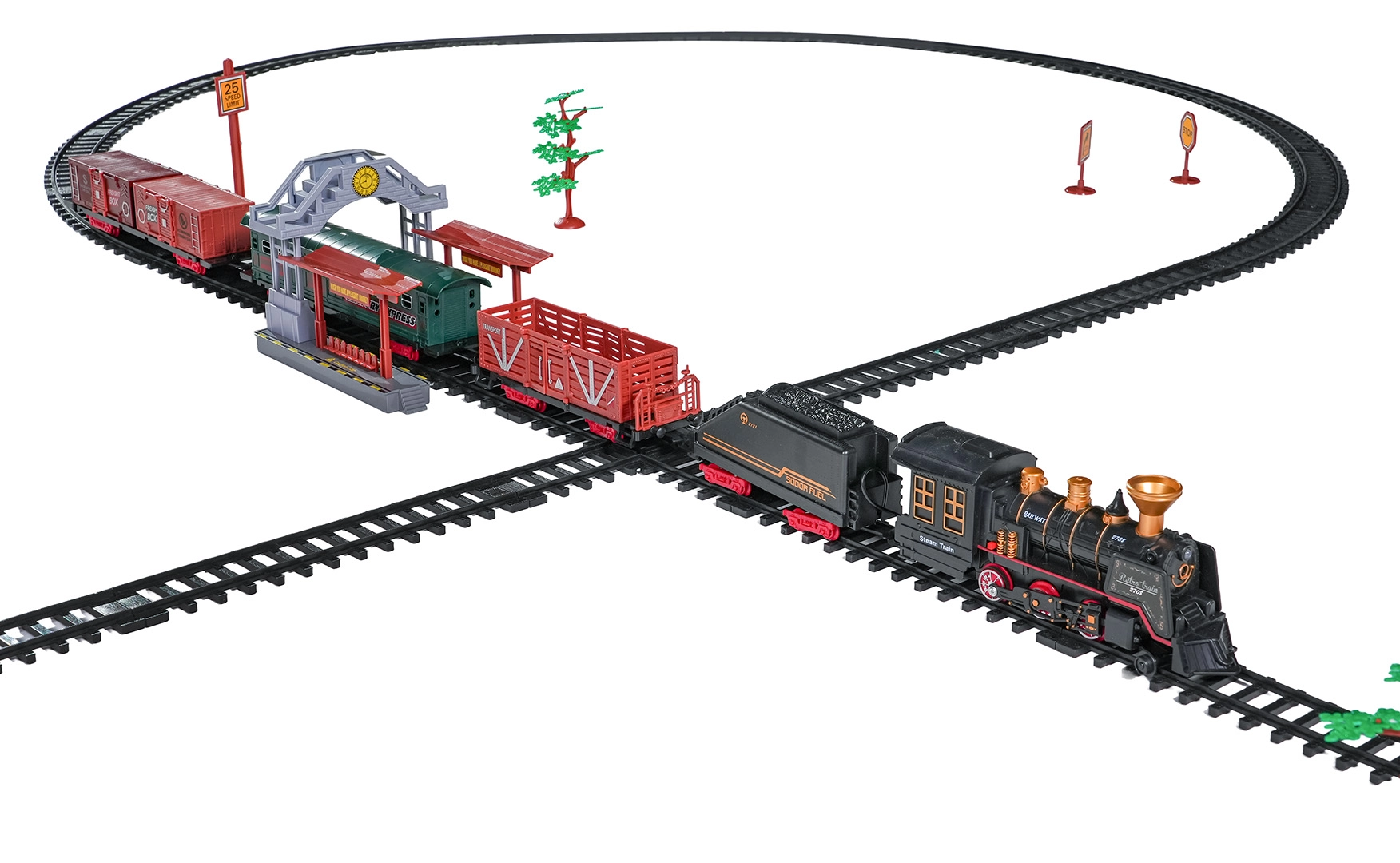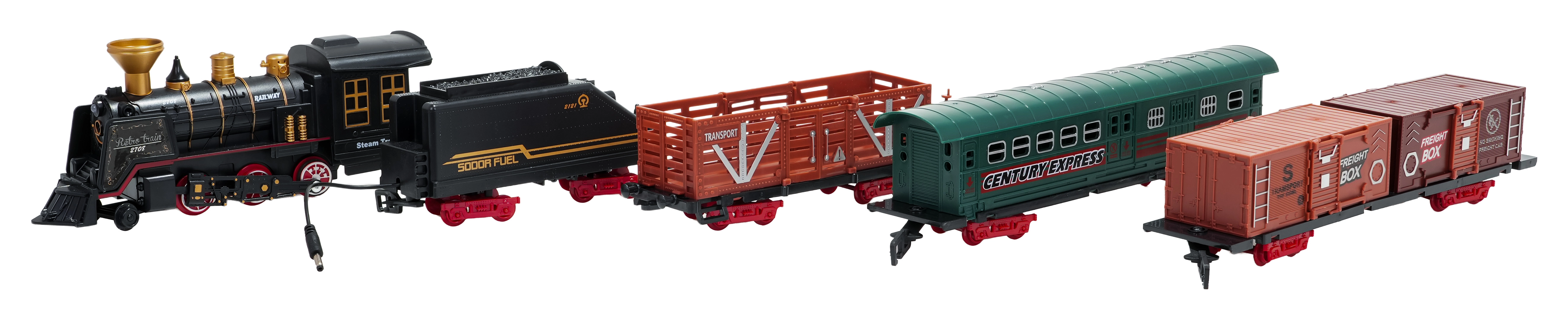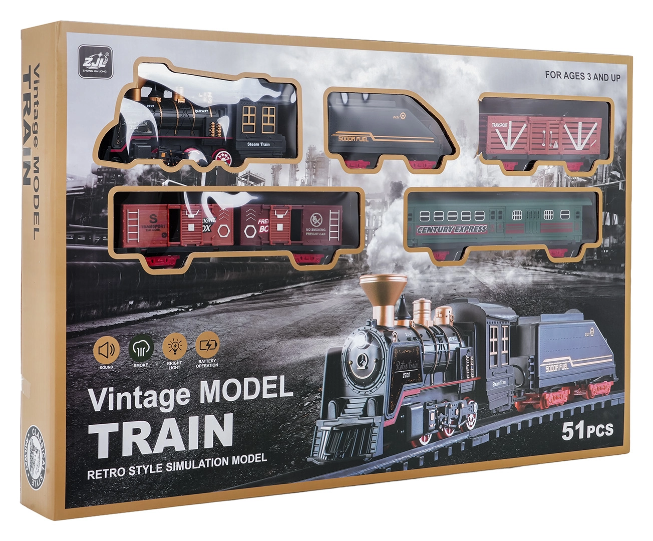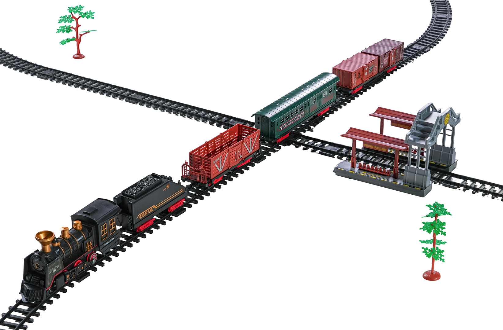Del paketa je celoten vlakovni komplet z lokomotivo, tenderjem, potniškim in tovornimi vagoni, kompletom tirov ter tematskimi dodatki, kot so drevesca in prometni znaki. Komplet spodbuja domišljijo, fino motoriko in potrpežljivost ter je idealno darilo za male ljubitelje železnic.