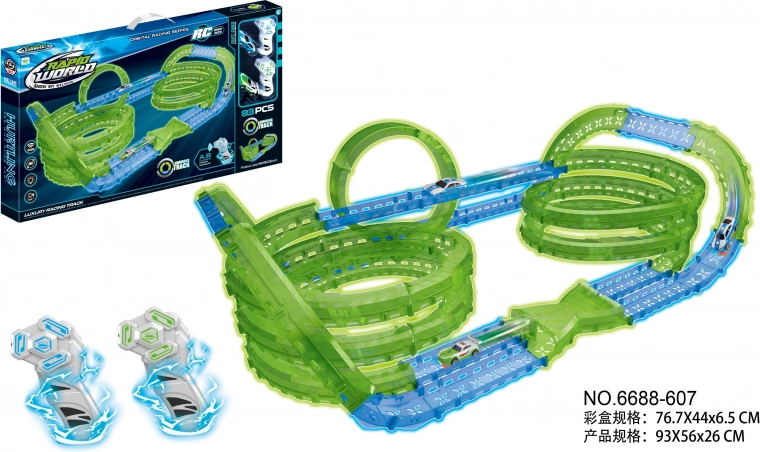 Ta velika svetleča dirkalna steza spremeni vsako otroško sobo v nočne dirke. Fluorescentni elementi steze lepo svetijo v temi, avtomobilčki z LED lučmi pa med vožnjo ustvarjajo impresivne svetlobne učinke. Sestavljanje steze razvija domišljijo in fino motoriko, sama vožnja pa podpira koordinacijo oko–roka.