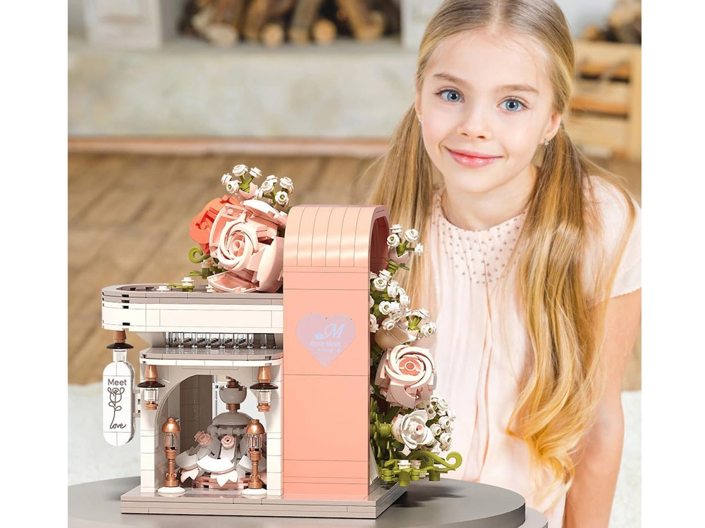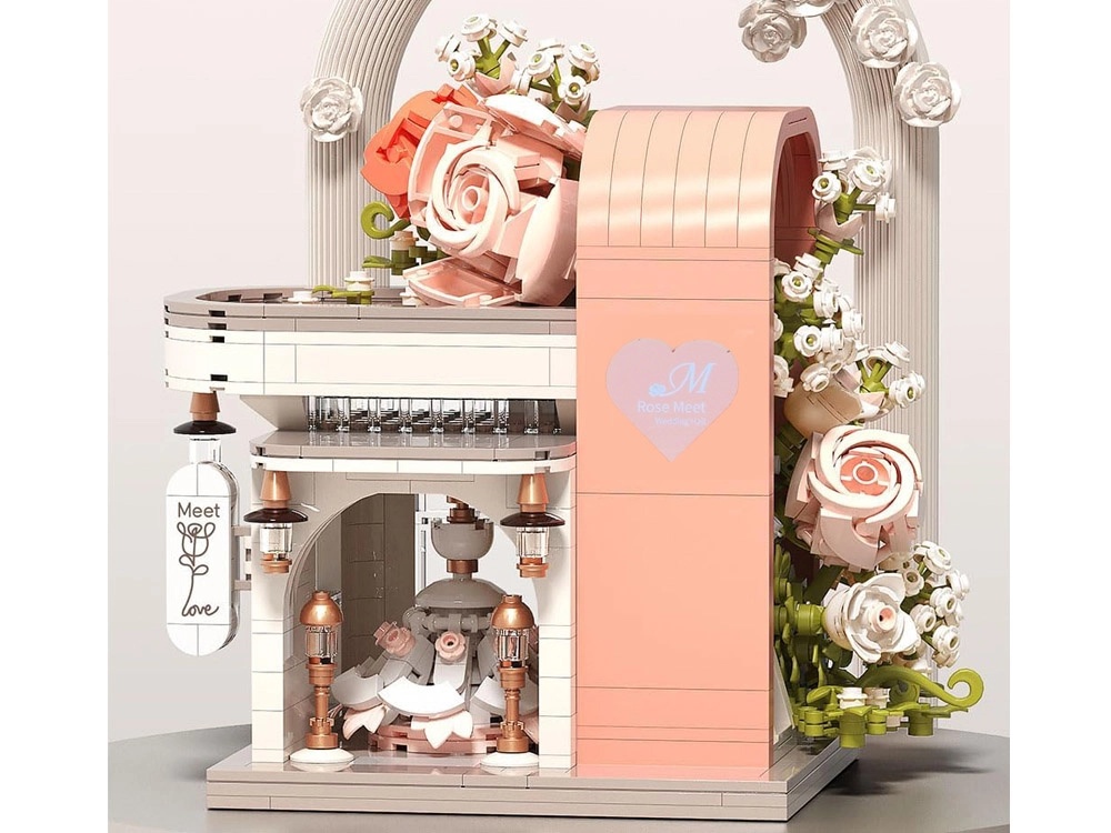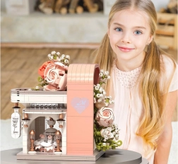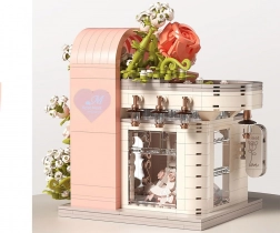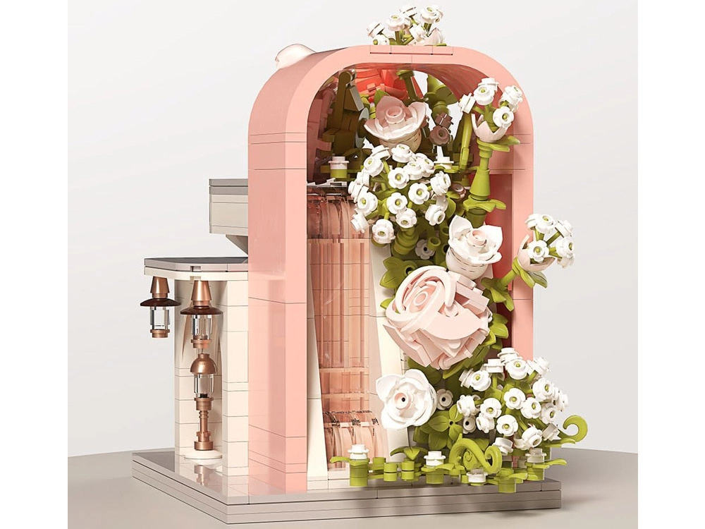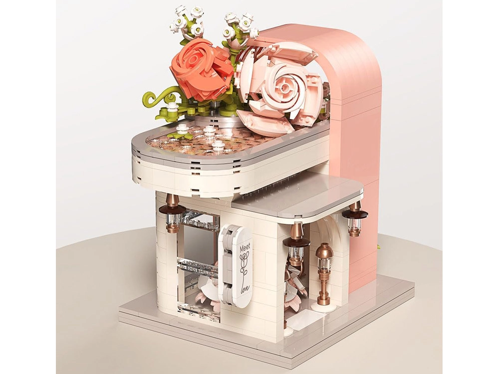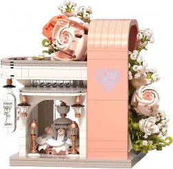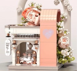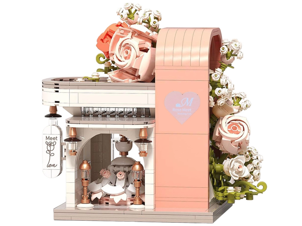 Ta romantični komplet bo vašo mizo spremenil v slikovito poročno sceno. Elegantna izložba z »zastekljenim« pročeljem razkriva glavno zvezdo – poročno obleko z nežnimi rožnatimi detajli, ki se ujemajo z belo, pudrasto rožnato in pastelno zeleno. Konstrukcijo obdajajo bogate cvetlične girlande, okraski na strehi in drobne luči pri vhodu, zaradi česar deluje kot pravljična izložba.
