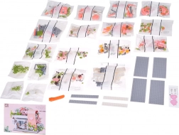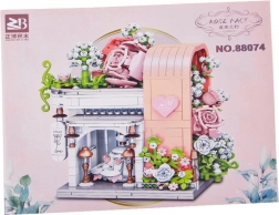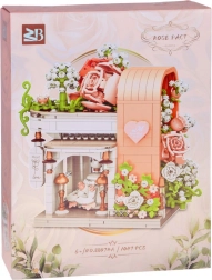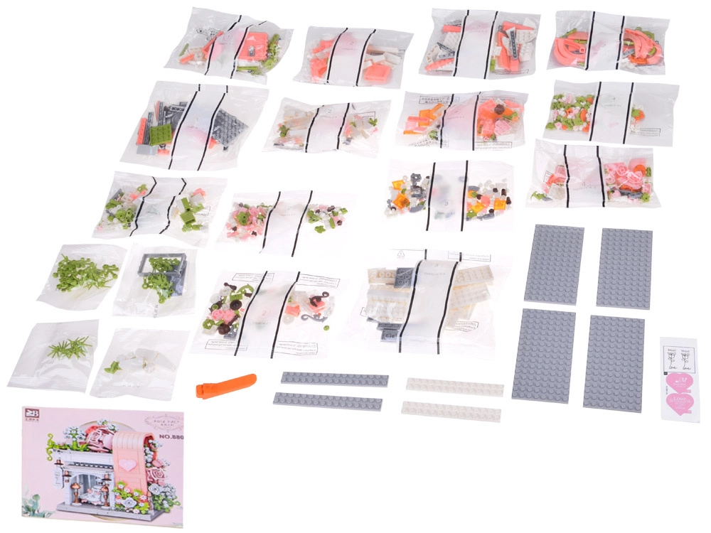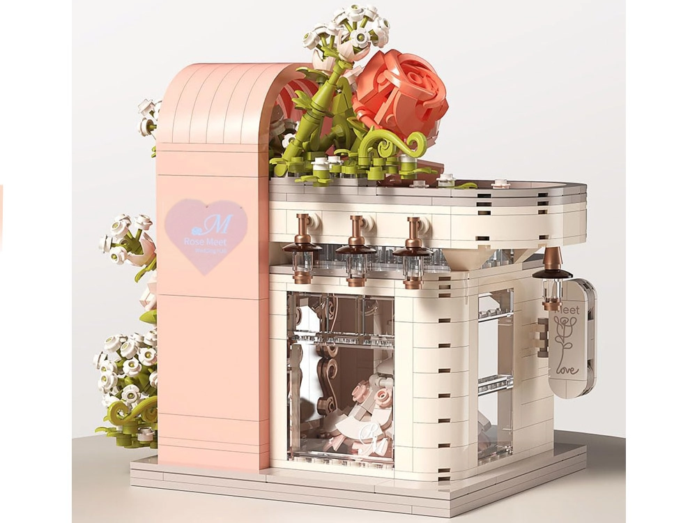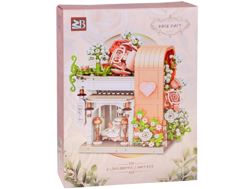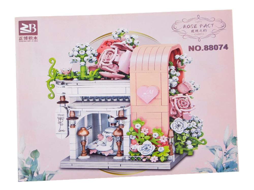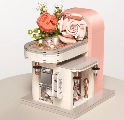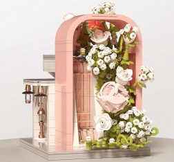 Ta romantični komplet bo vašo mizo spremenil v slikovito poročno sceno. Elegantna izložba z »zastekljenim« pročeljem razkriva glavno zvezdo – poročno obleko z nežnimi rožnatimi detajli, ki se ujemajo z belo, pudrasto rožnato in pastelno zeleno. Konstrukcijo obdajajo bogate cvetlične girlande, okraski na strehi in drobne luči pri vhodu, zaradi česar deluje kot pravljična izložba.