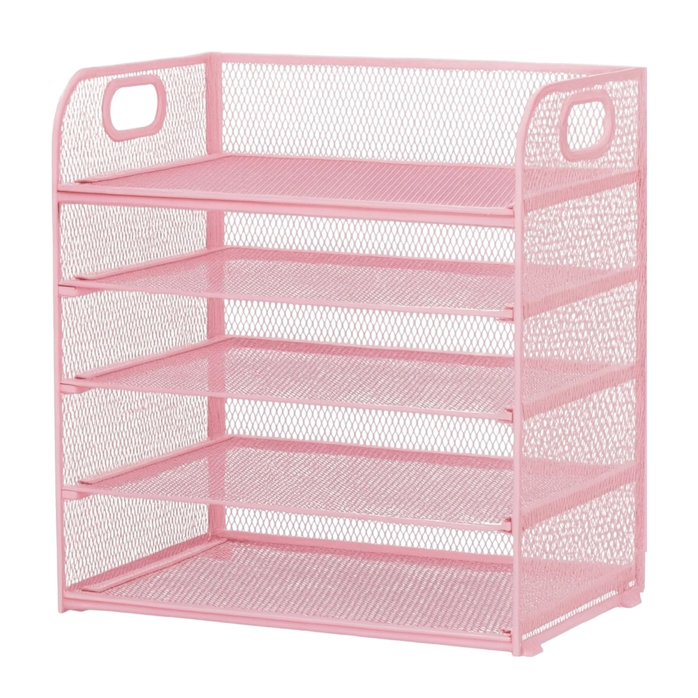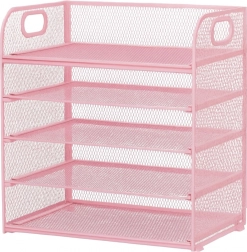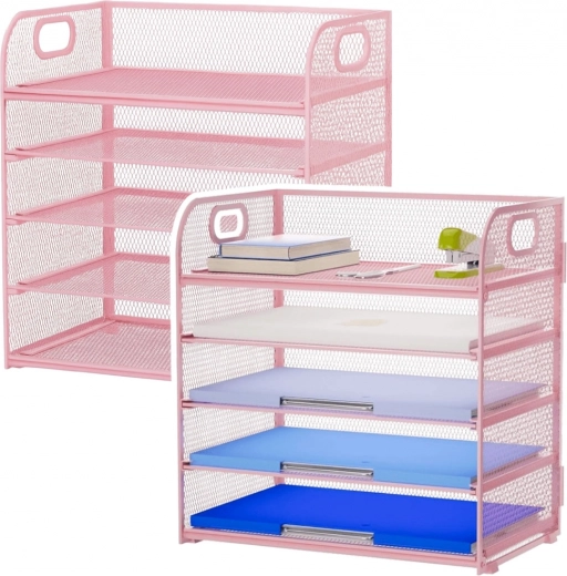 Uredite svojo delovno površino pregledno in elegantno. Rožnat kovinski organizator ponuja pet praktičnih polic, v katere lahko preprosto shranite dokumente, mapice, prosojnice, zvezke in drobne pisarniške potrebščine. Zaradi modernega videza iz kovinske mrežice se odlično poda sodobnim interierjem.